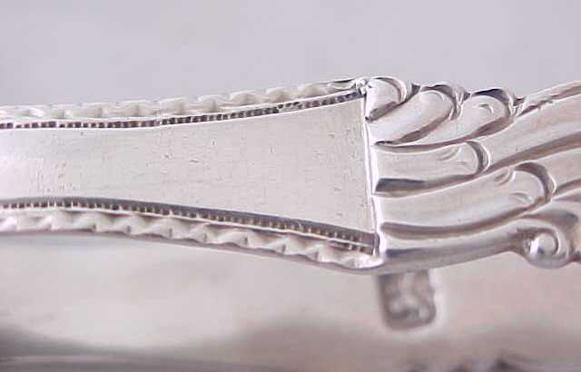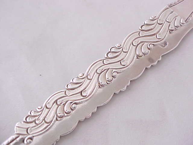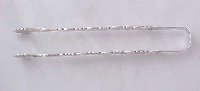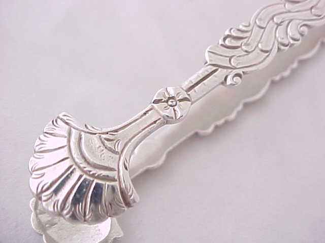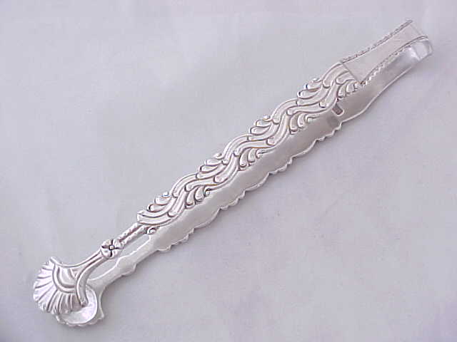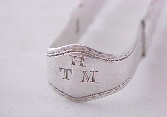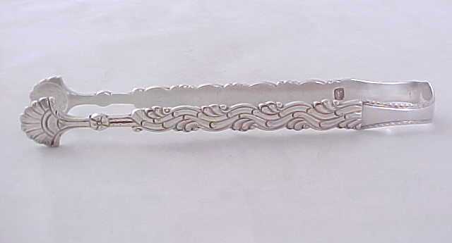 Georgian silver cast sugar tongs made as usual in three parts, two cast arms soldered to the shoulders and correctly marked on or near the two joints. narrower than usual and with the original betrothal engraving to the bow. |