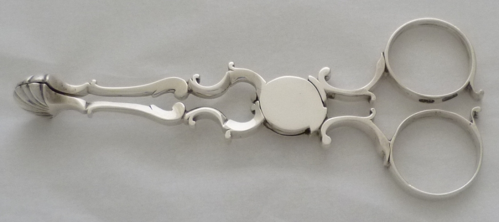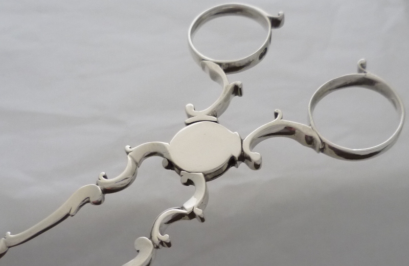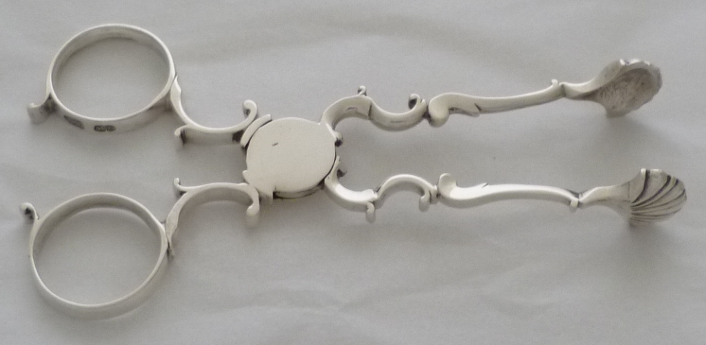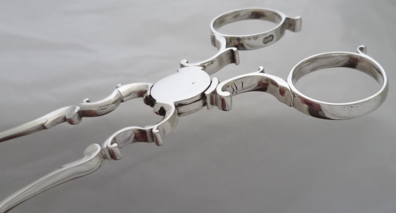 Good pair of Georgian silver sugar nips with 'C' scroll arms and shafts, broad five lobe grips and exceptionally well struck and clear hallmarks to both finger rings. |