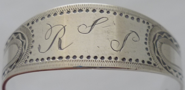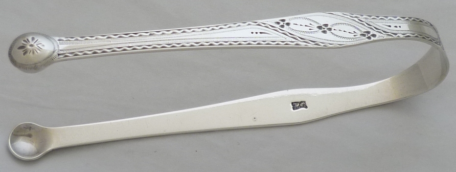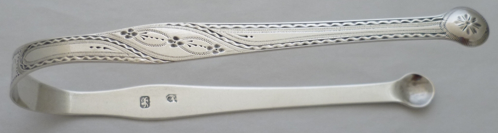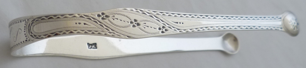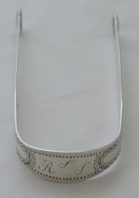 Very good pair of Georgian silver sugar tongs with round grips, very well preserved bright cut engraved decoration and original engraving 'R & S' to the bow. |