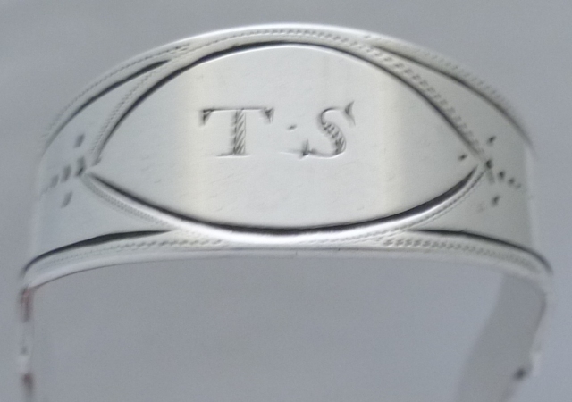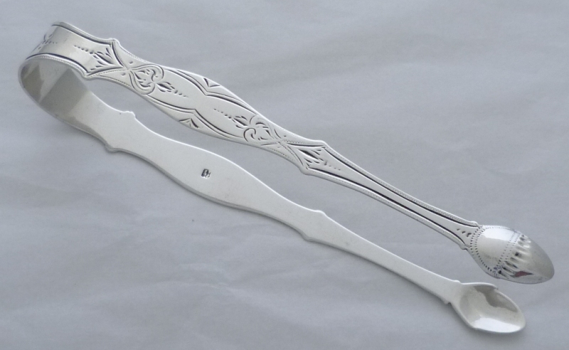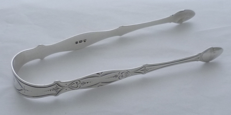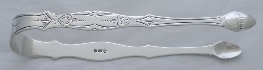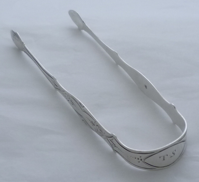 Pretty pair of Georgian silver sugar tongs with engraved decoration, acorn bowls and original initial engraving to the bow. |