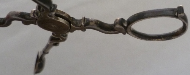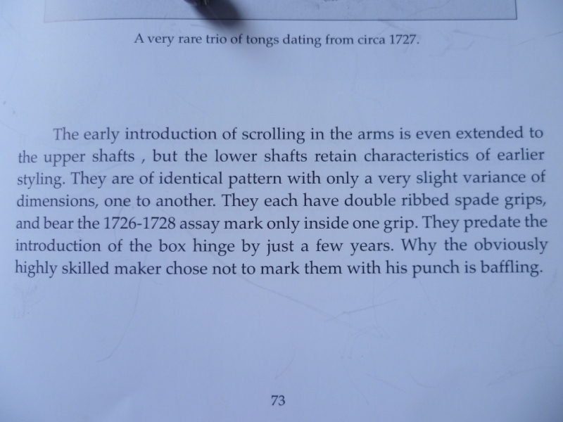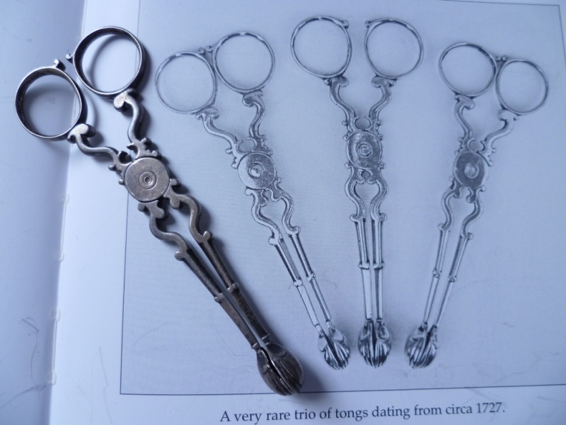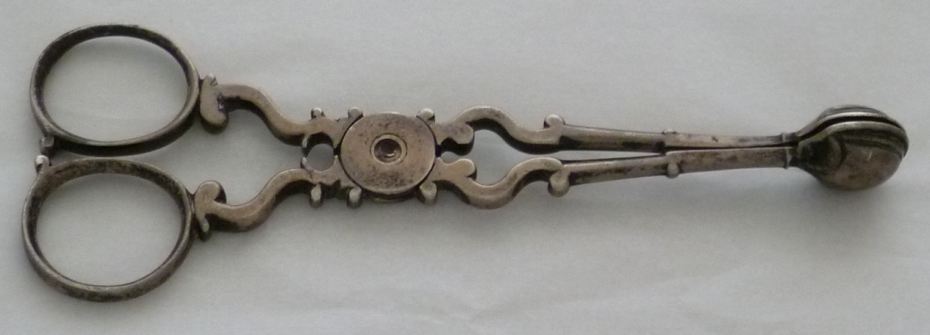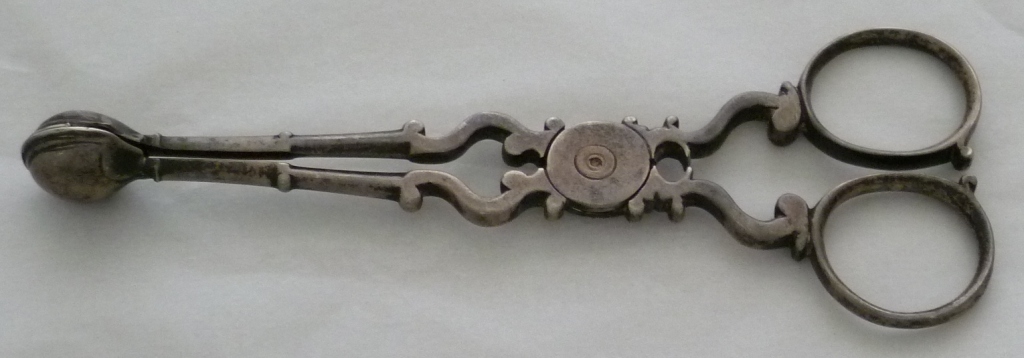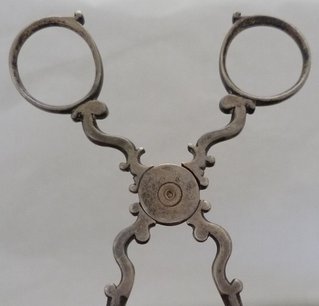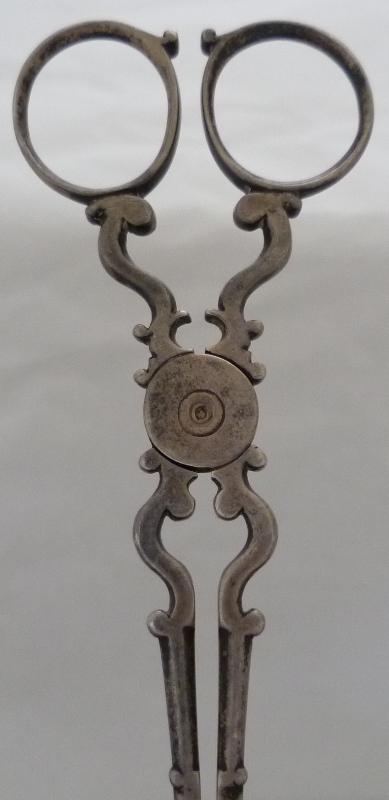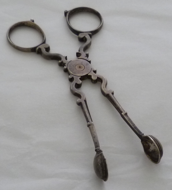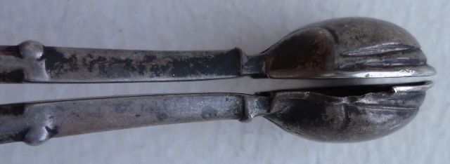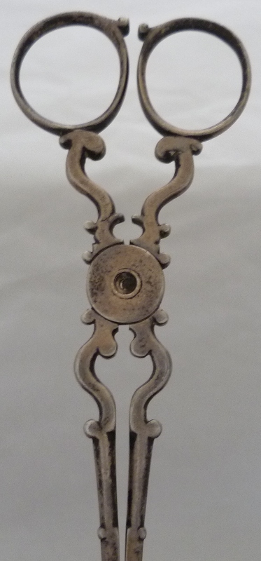 Early pair of Georgian silver sugar nips with 'C' scroll arms and upper shafts, double ribbed spade grips and only hallmark a lion passant (late 1720s series) within one grip. A match to the trio illustrated and discussed by Shlosberg page 73. |