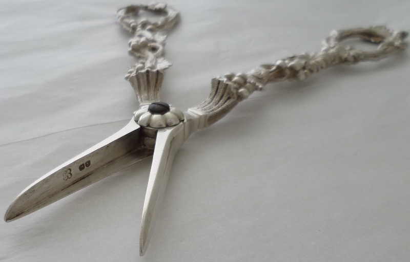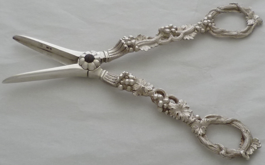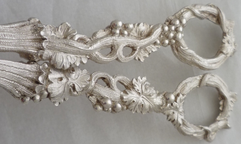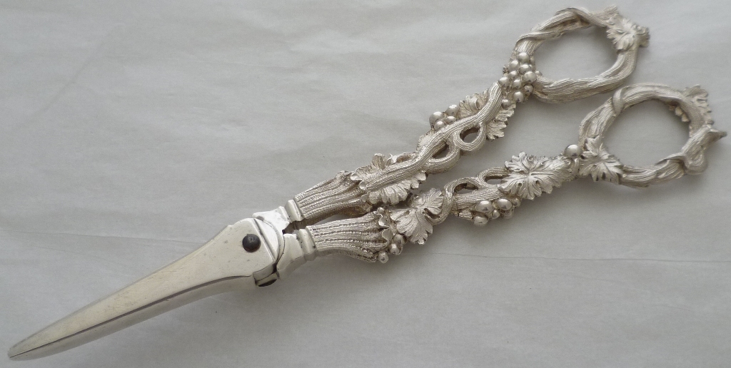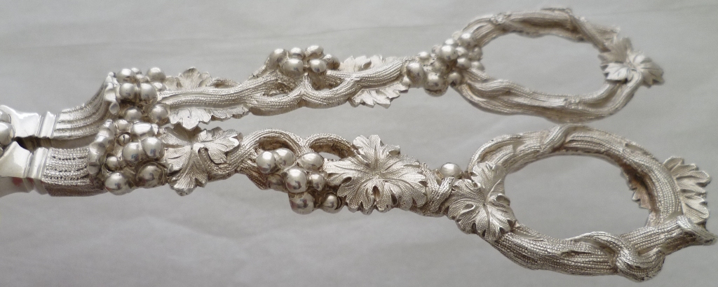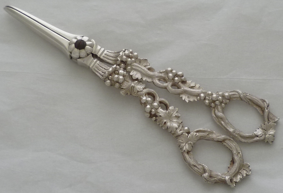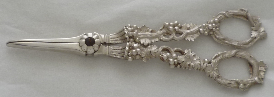 Pair of early Victorian cast silver grape scissors with highly detailed and naturalistic entwined grape vine decorated arms and finger rings. |