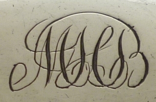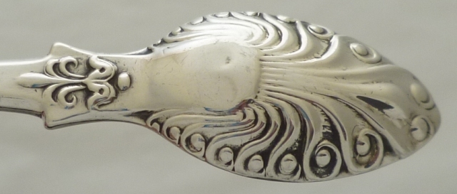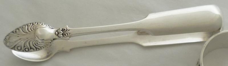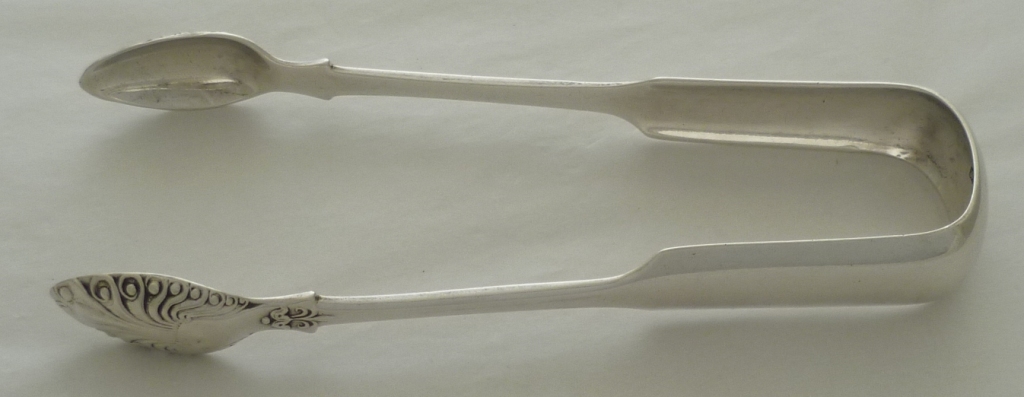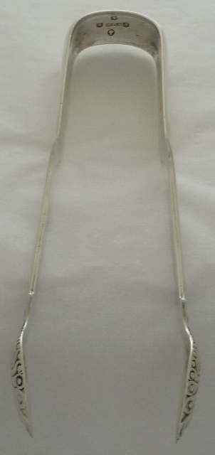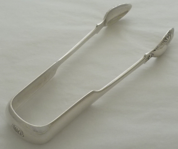 Large and surprisingly heavy early Victorian Scottish silver Fiddle pattern sugar tongs with large decorative grips and original monogram engraving to the bow. |