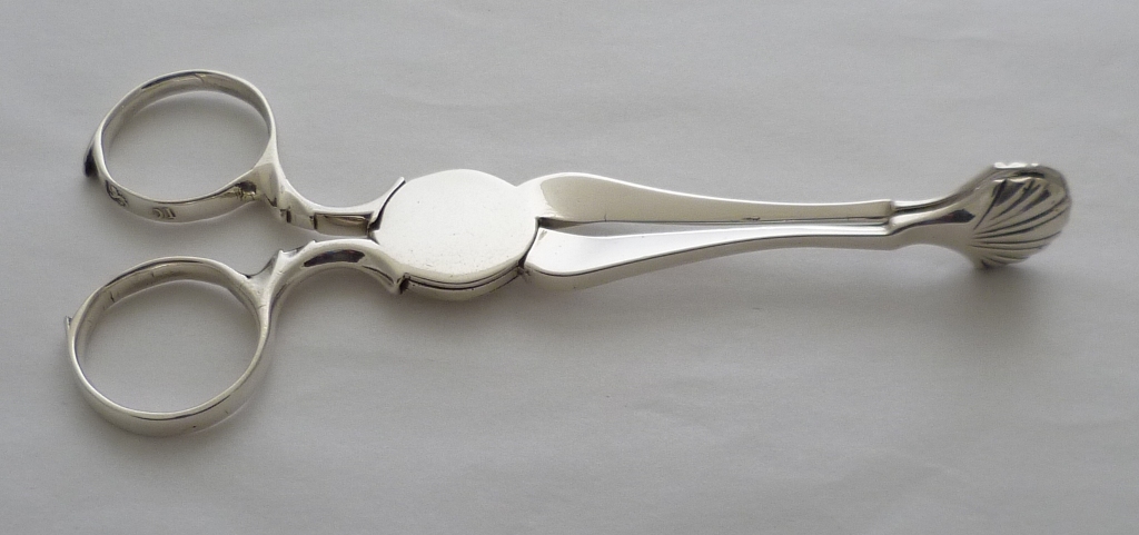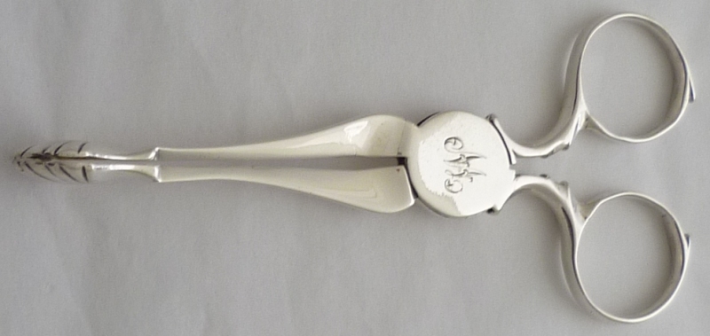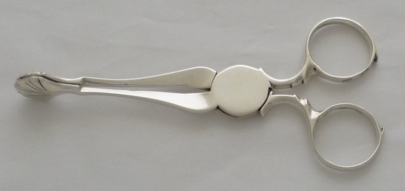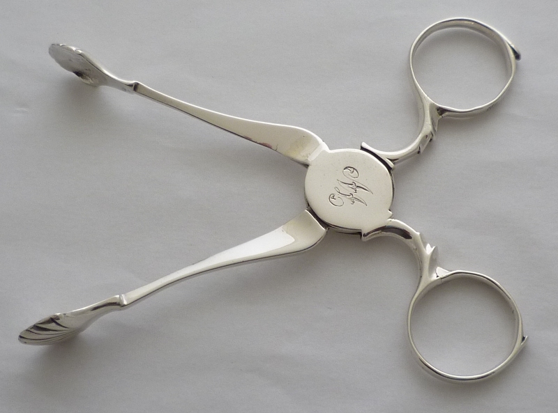 Pair of Georgian cast silver sugar nips with 5-lobe grips, simple yet elegantly tapering shafts that retain at their tops a hint of the earlier 'dummy sugar cutters', a concealed box hinge engraved 'W' ( also works as 'M') and arm decoration peculiar to the very middle of the 18th century. |