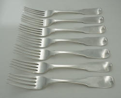 Seven 8" Irish Georgian Silver Fiddle Table Forks, John Power, Dublin 1803, 202mm, 503g. |