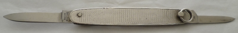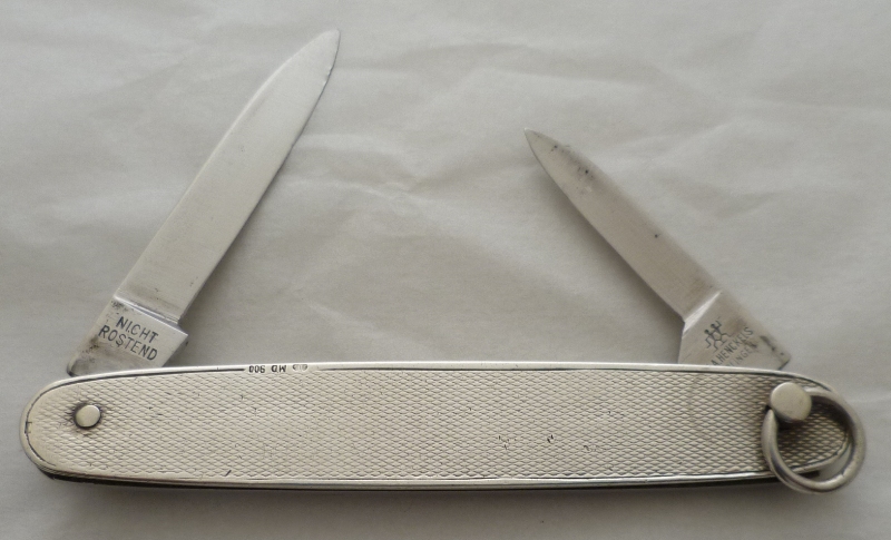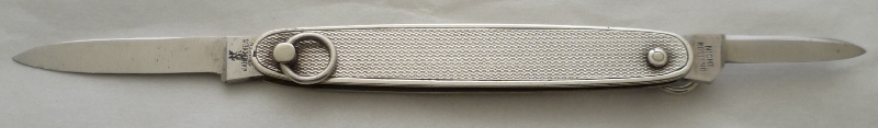 Ingenious German higher grade silver bodied twin bladed pocket knife. The blades extend by rotation of the suspension rings. |