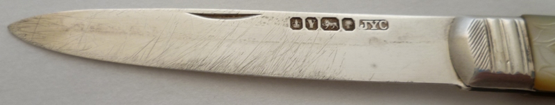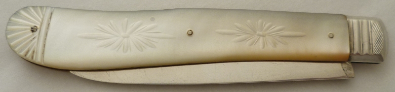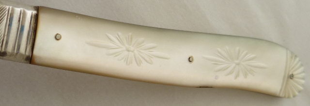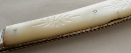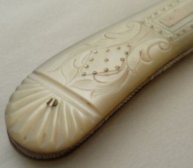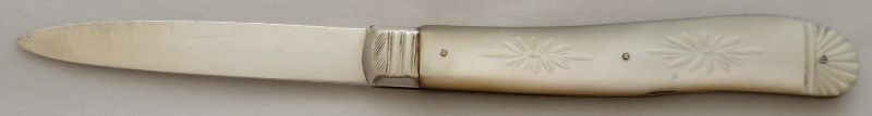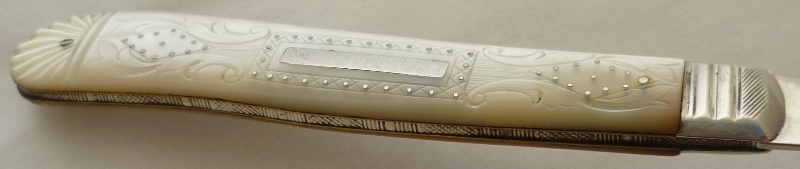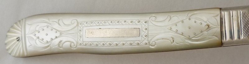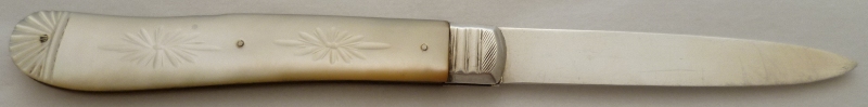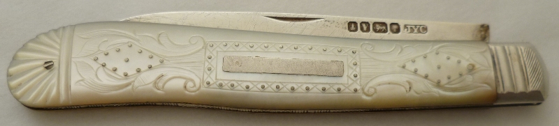 Large Victorian silver folding fruit knife with plain silver blade and shaped mother of pearl handle beautifully engraved, studded and inset with a blank rectangular cartouche. |