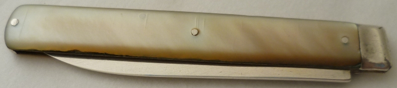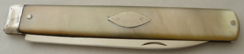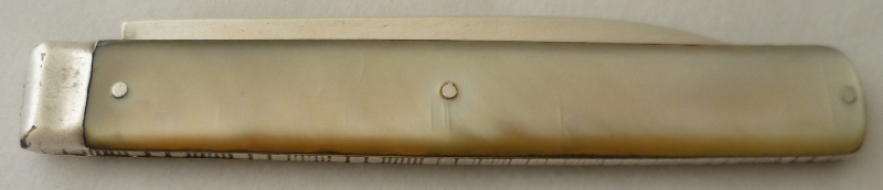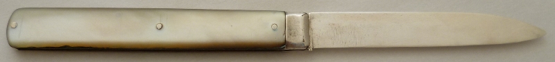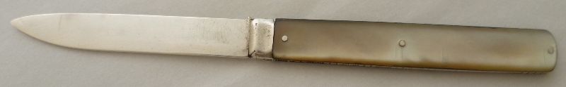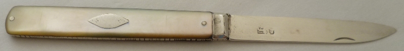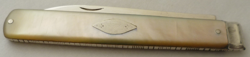 Georgian silver folding fruit knife with a plain silver blade and mother of pearl handle inset with a cartouche. |