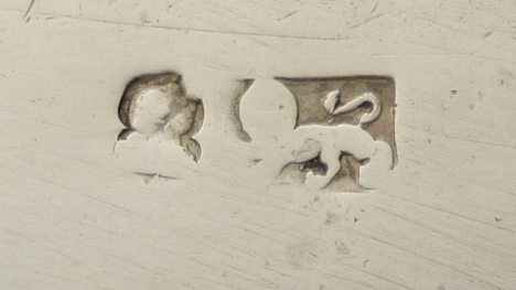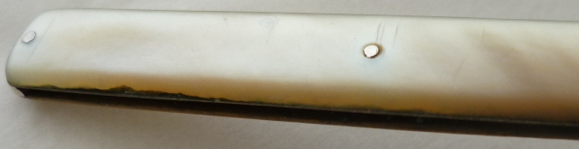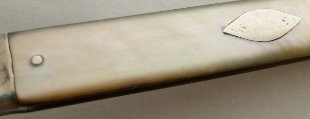 good action with perpendicular stop, tiny mop chip to two corners next to the collar and micronibbles to the underside of one edge, very thick silver plating to the collar rubbed at high points, merest traces (the transverse parallel lines) of mop engraving extant. |