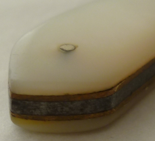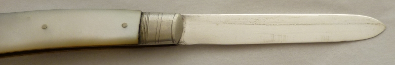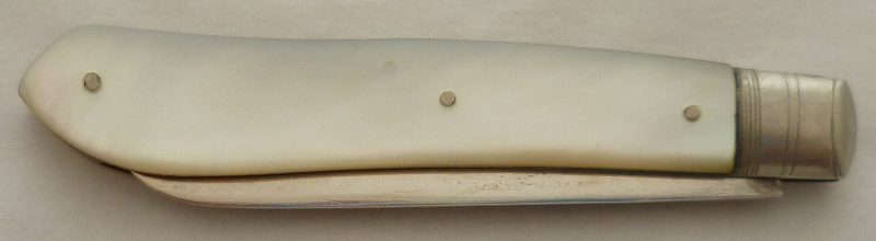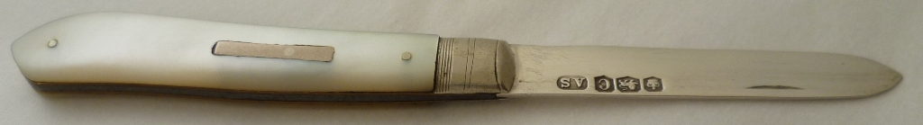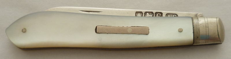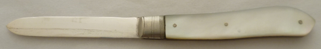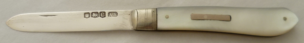 Silver folding fruit knife with plain silver blade and shaped mother of pearl handle inset with a blank rectangular cartouche. |