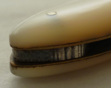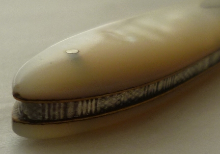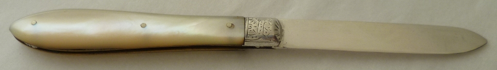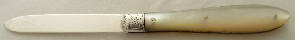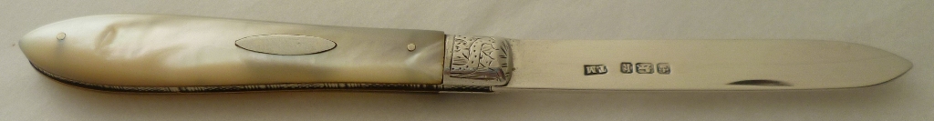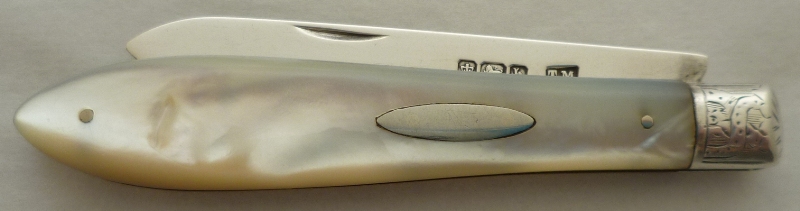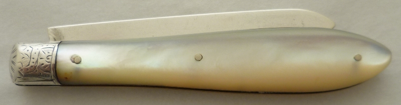 Folding fruit knife with plain silver blade and shaped mother of pearl handle inset with a blank oval cartouche. |