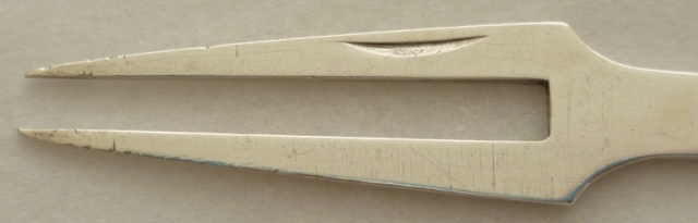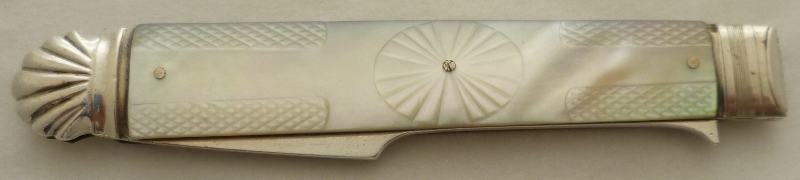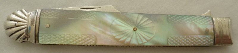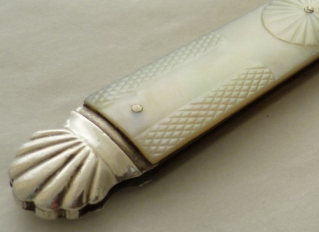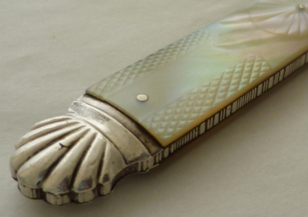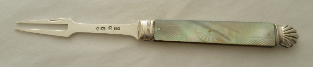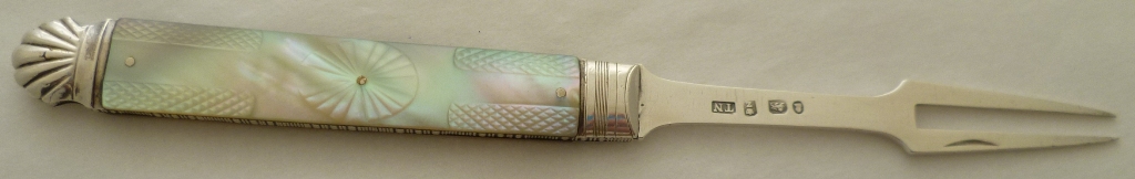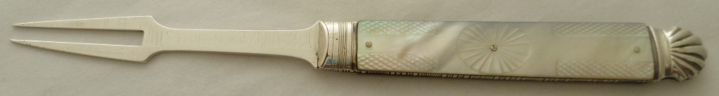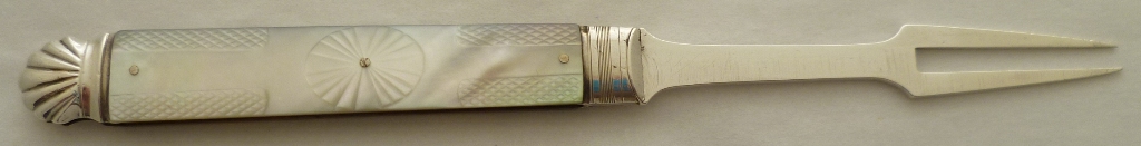 Georgian silver folding fruit fork with spectacularly iridescent and beautifully engraved mother of pearl handle and a shell terminal. |