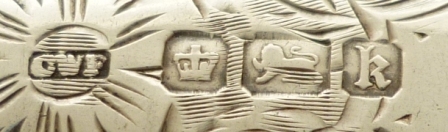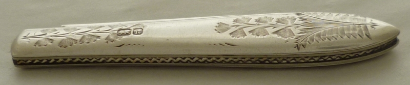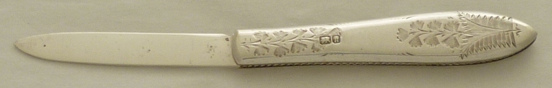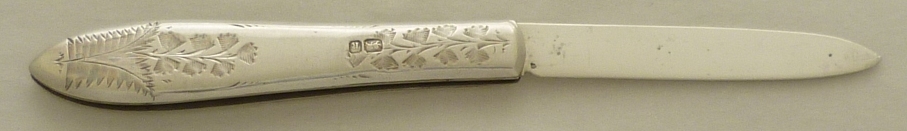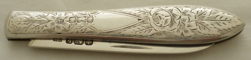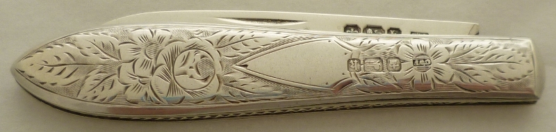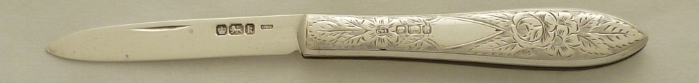 Folding fruit or pocket knife with plain silver blade and engraved silver body beautifully decorated with flowers, foliage and a blank shield shaped cartouche. |