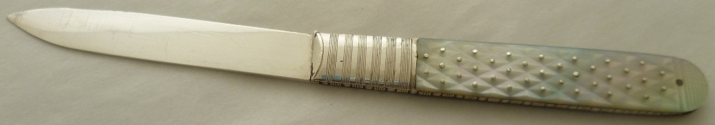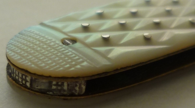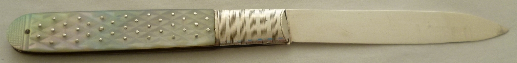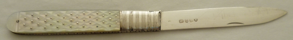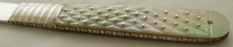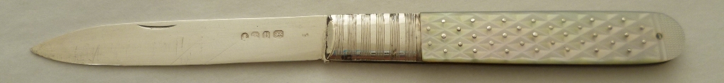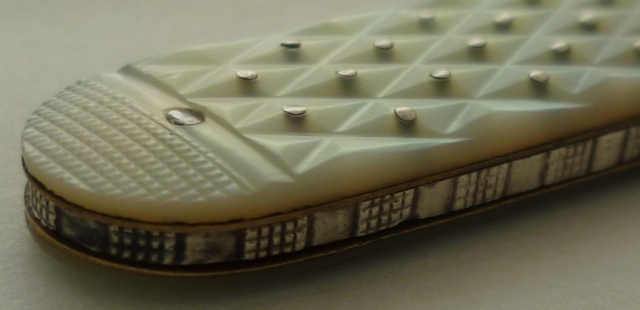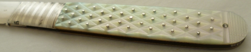 Georgian silver folding fruit knife with plain silver blade and mother of pearl handle beautifully coloured, diaper engraved and studded. |