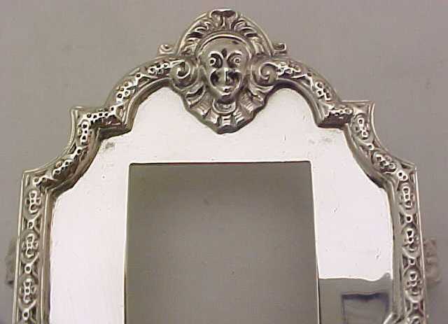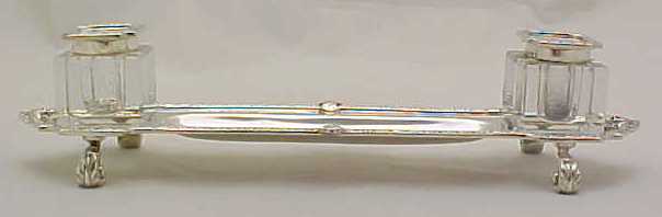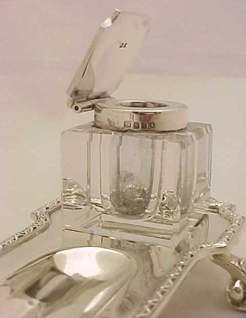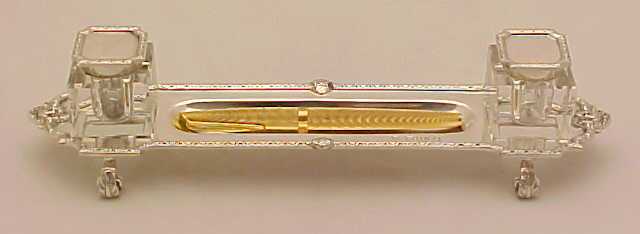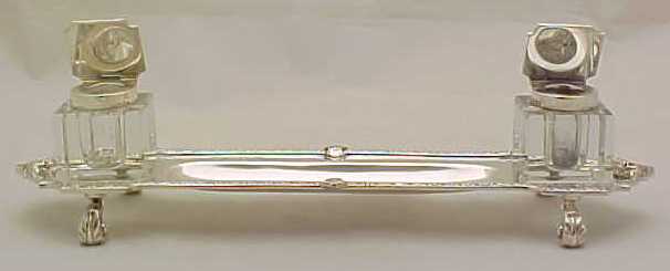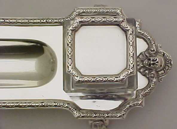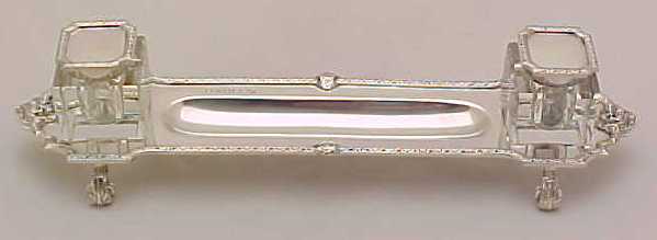 Gorgeous silver double inkstand with central pen tray, leaf capped scrolling feet and mask decorated terminals. The bottles are original with perfect hinges and every piece of silver is correctly marked. Shown in the last image with a slightly later gold fountain pen. |