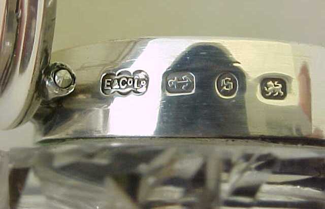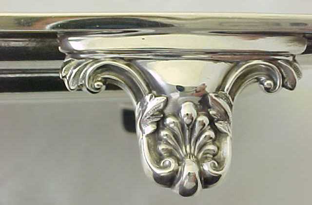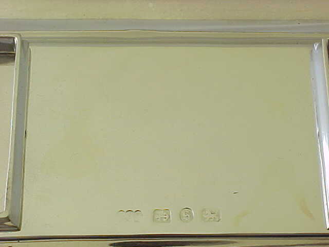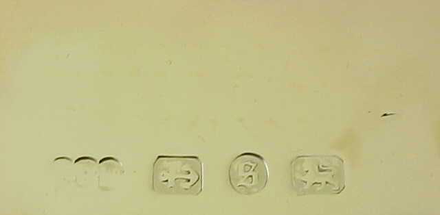Generally excellent, but a few points to mention. One lid, not including the collar, may be a replacement as it is unmarked. I have had both hinge pins replaced so the action is now excellent. I believe that the central section between the two pots has a very well executed erasure. The little mark to the above right of the main hallmarks could be evidence of an erased engraving although the silver is very thick and so I cannot be certain. |