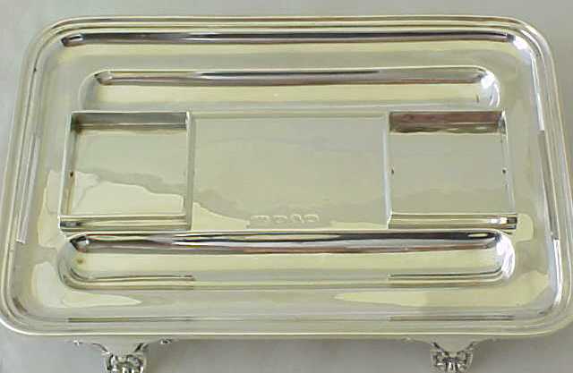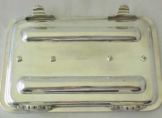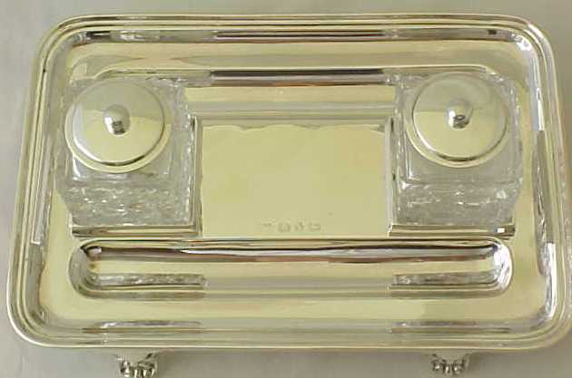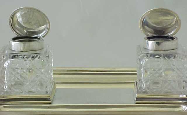 Superb quality and surprisingly heavy Victorian silver inkstand with two silver lidded cut glass bottles and two pen wells. |