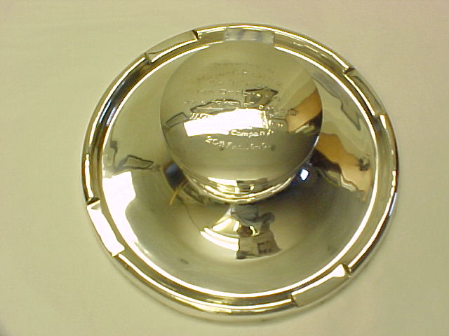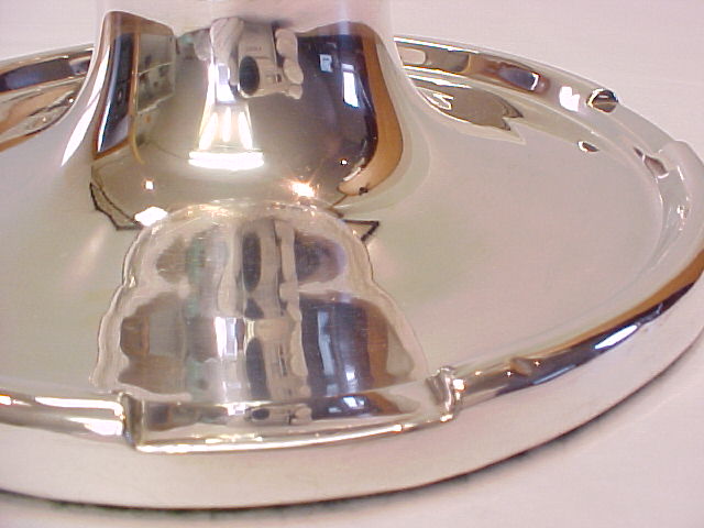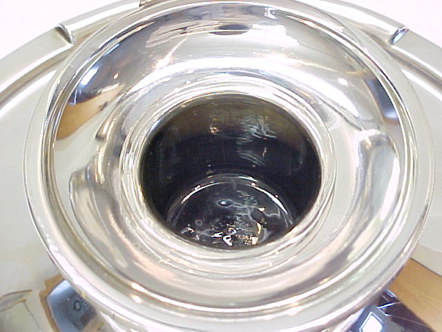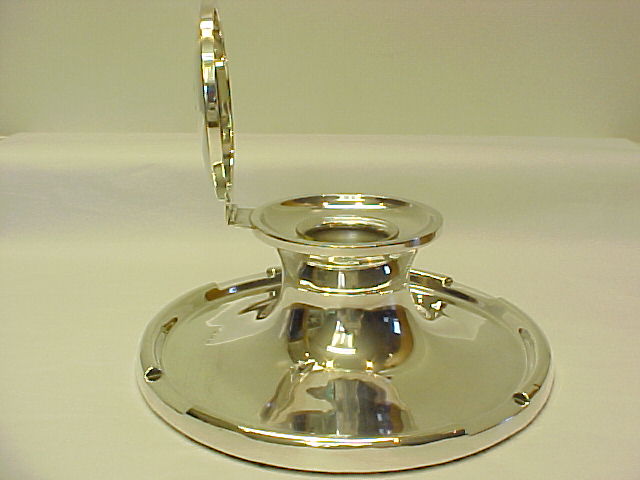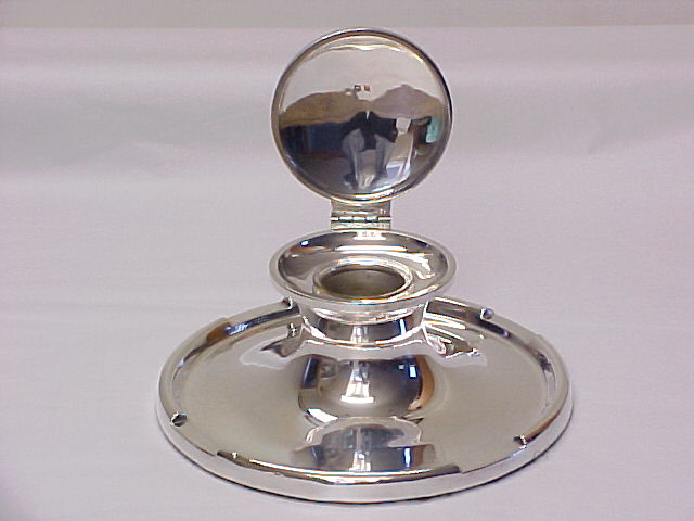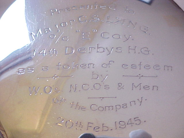 Massive circular silver ink-well with pen holders front and rear. Replacement clear glass liner and green felt to the loaded base. Hinged lid with WWII 14th Derbyshire Home Guard presentation inscription. |