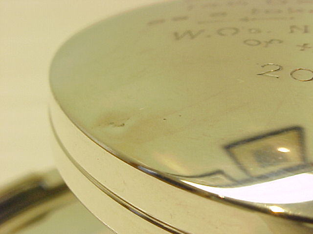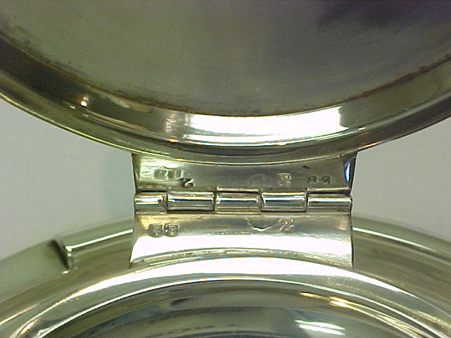 very good with minor hinge play and only insignificant base rim bumps. The silver lid is thick and the engraving light so I could successfully erase the inscription for £30. |