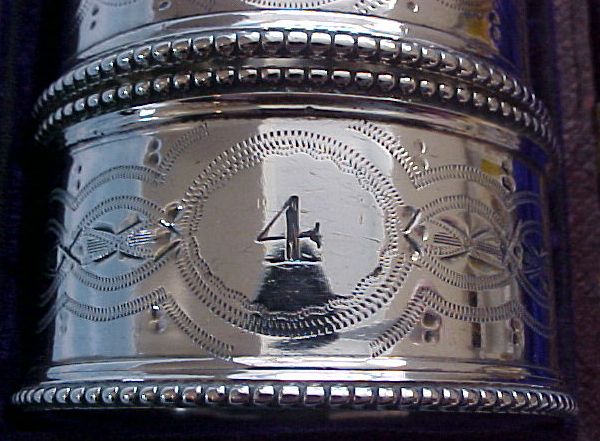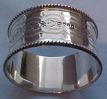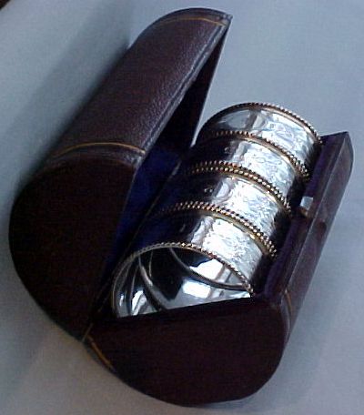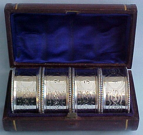 Set of silver napkin rings numbered 1 to 4 and fitted within a silk, velvet and leather case. |