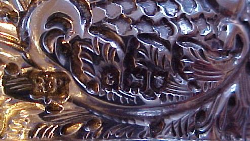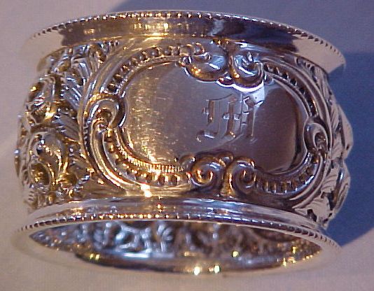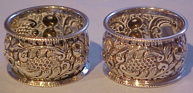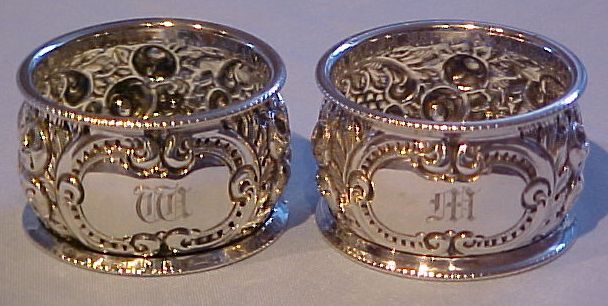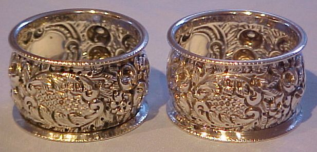 Pair silver napkin rings with exuberant embossed decoration. Each has an initial engraved cartouche (one is upside down in the images). |