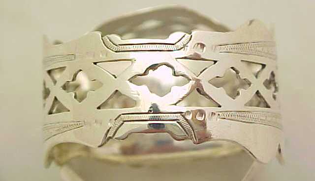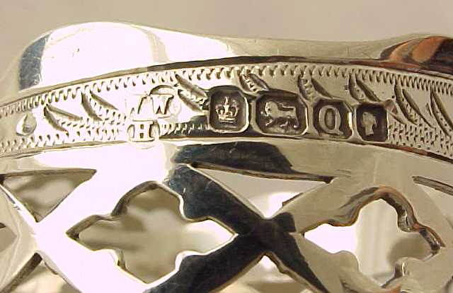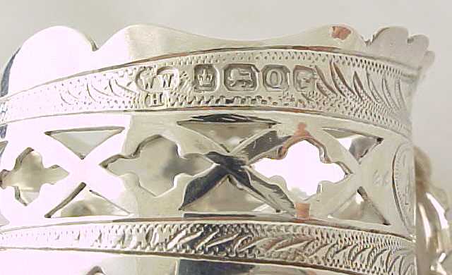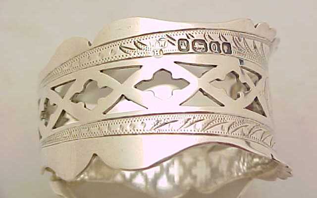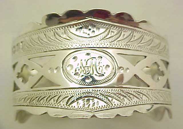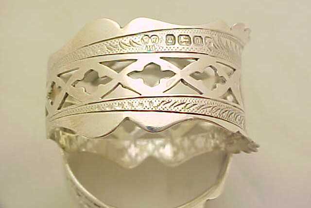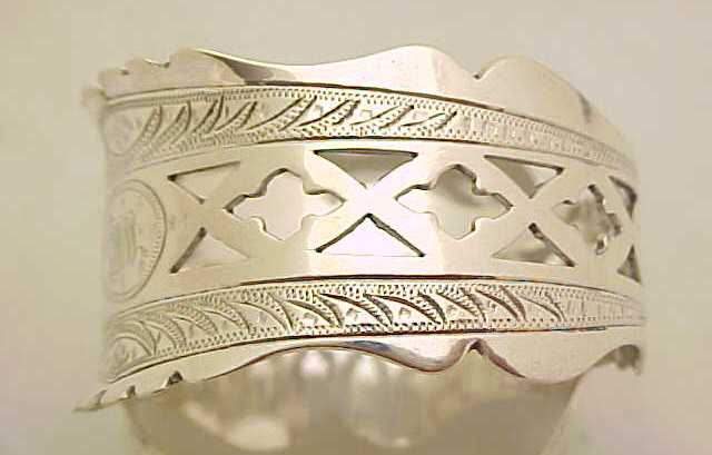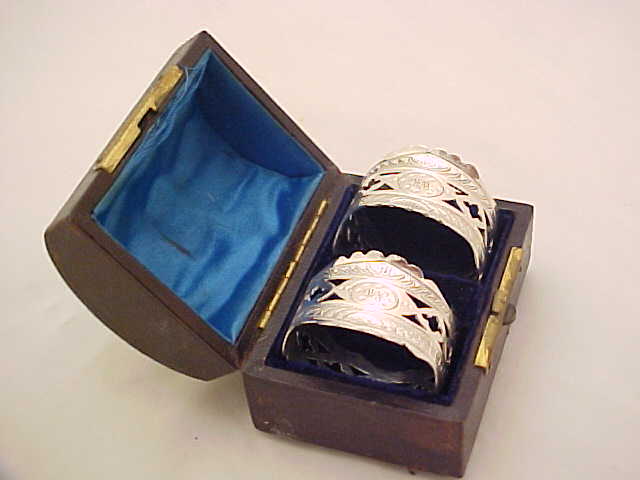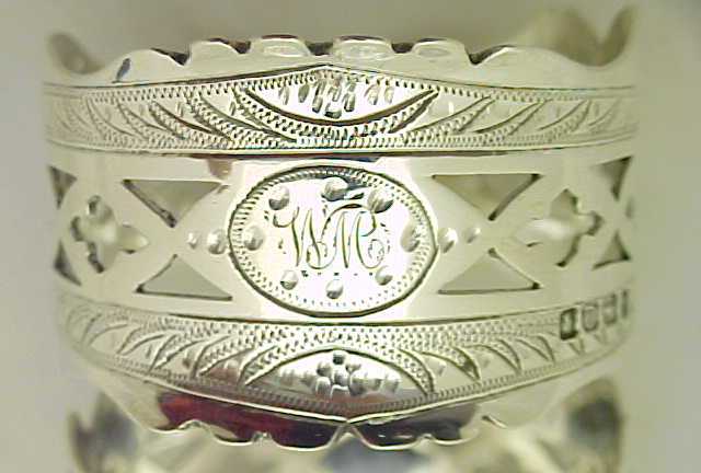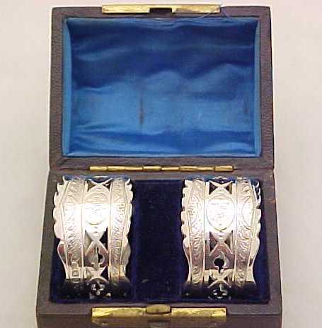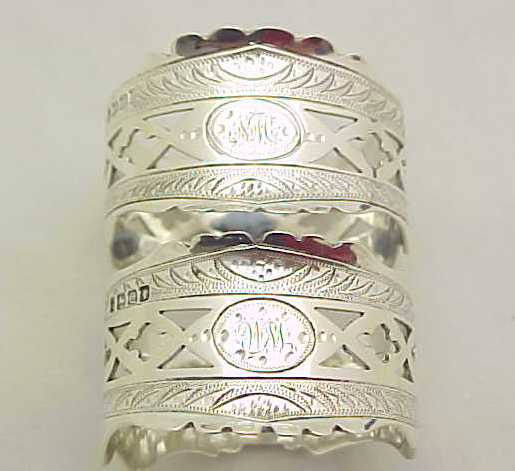 Superb pair of Victorian Gothic revival silver napkin rings, both completely hand pierced and hand engraved and contained within a fitted silk and plush velvet lined case. One engraved 'NM' within an oval cartouche, the other engraved 'WM'. |