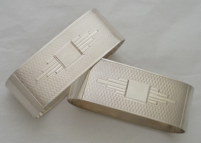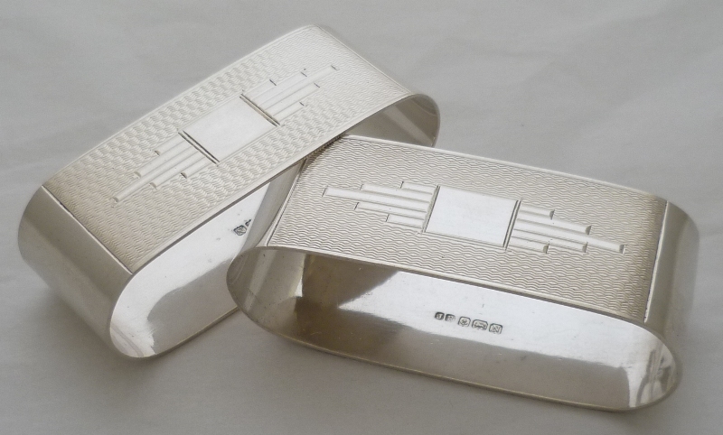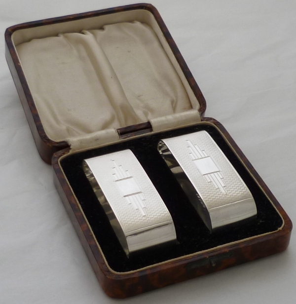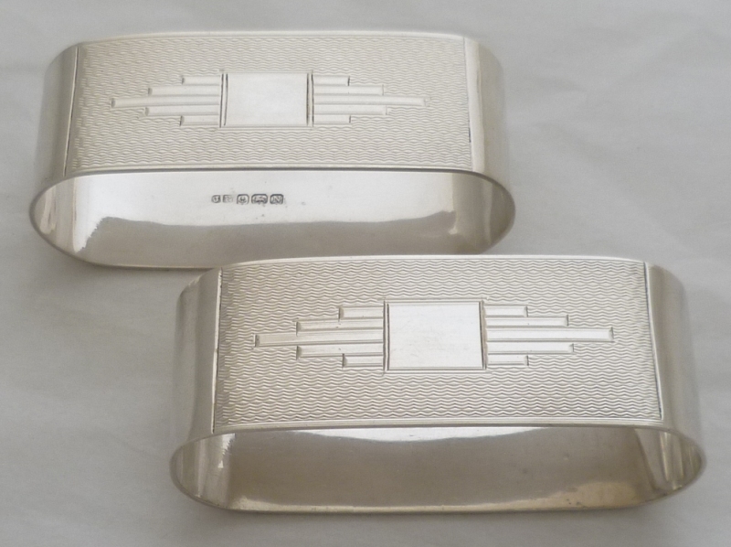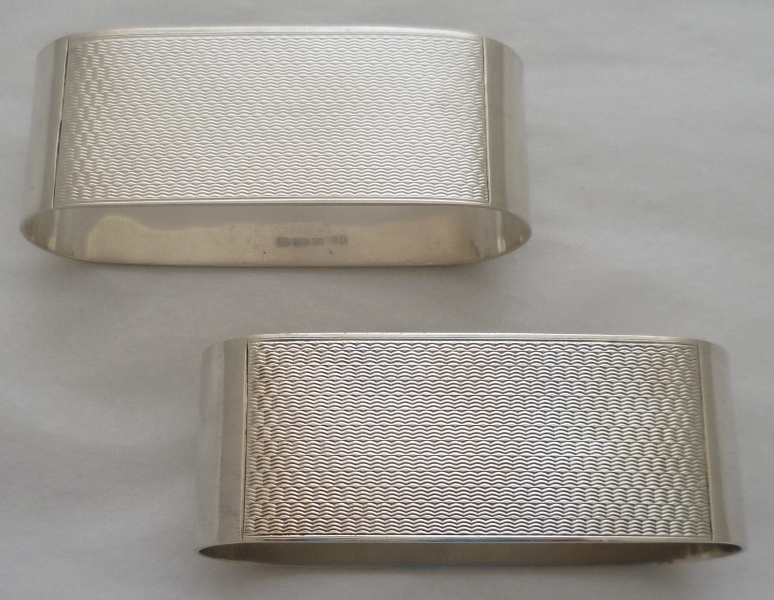 Cased pair of solid silver Art Deco napkin rings with engine turned engraved decoration and blank cartouches. |