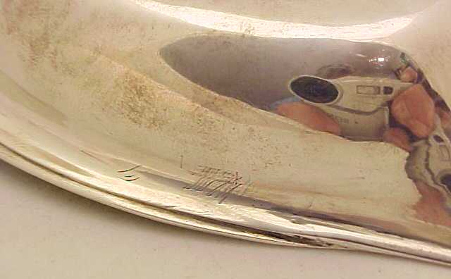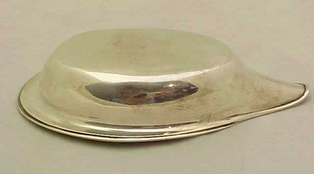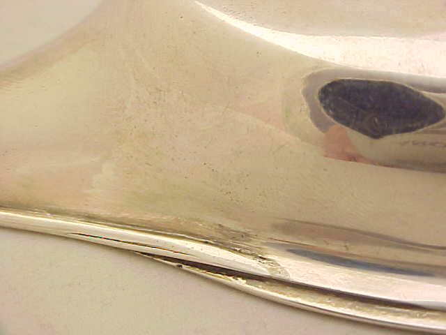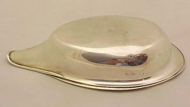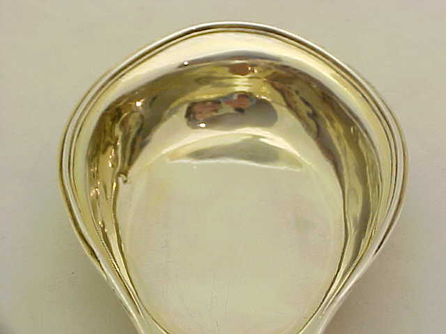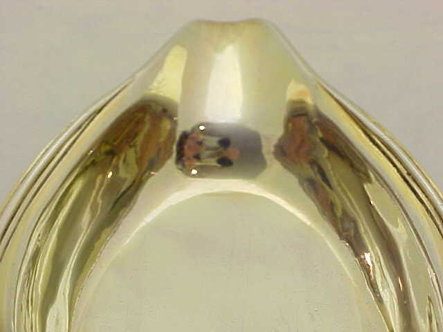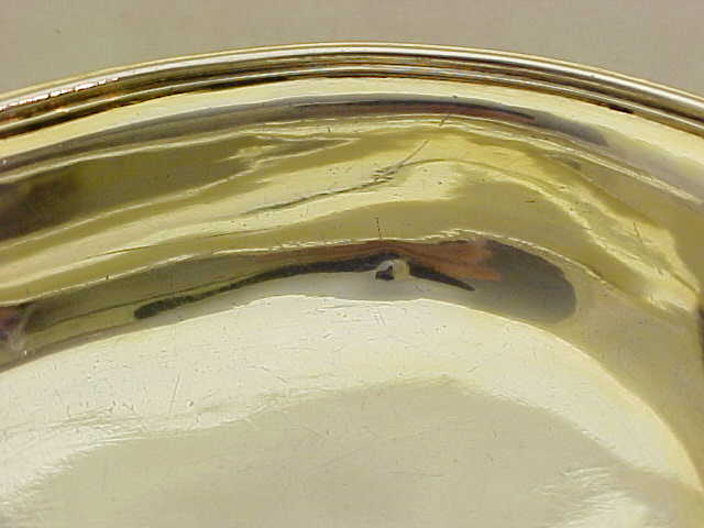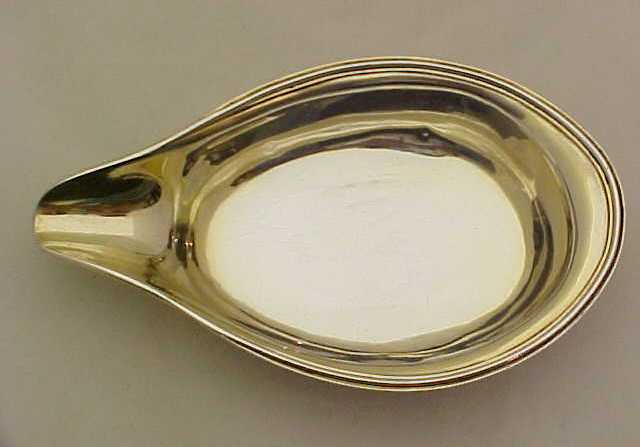 Georgian silver pap boat with an applied reeded top rim, gilded interior and pointed oval bowl. These items were used for feeding pap, a semi-liquid made from bread, milk and optional alcohol, to infants and invalids. The gilded interior, large size and strong construction leads me to believe that this boat was designed for use by an adult, quite possibly invalided from one of the many wars that Britain pursued during this period to consolidate the empire. The reeded top rim gives this piece strength and rigidity and a little extra sign of quality is the lip rim that has been turned over upon itself for the same reasons. I have pictured below the junction of the lip rim, top rim and body where you can still see the original solder. |