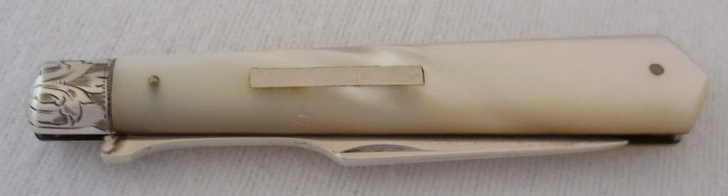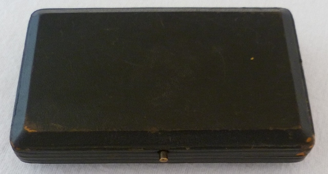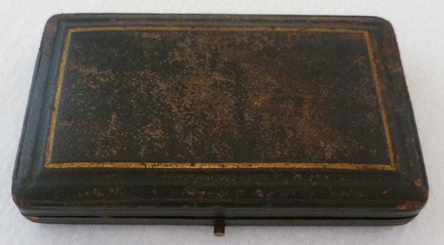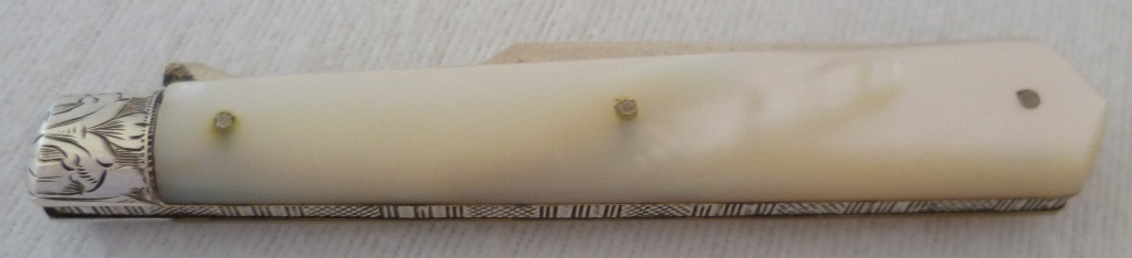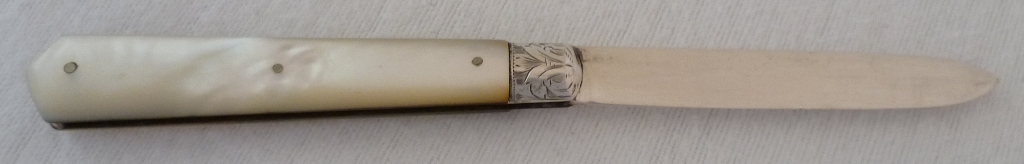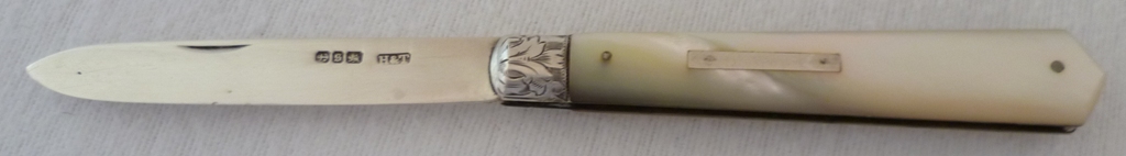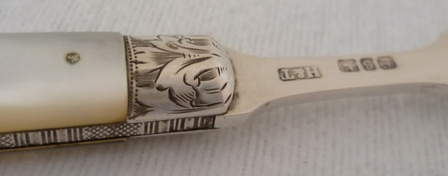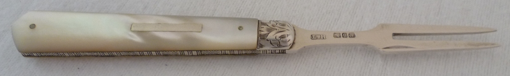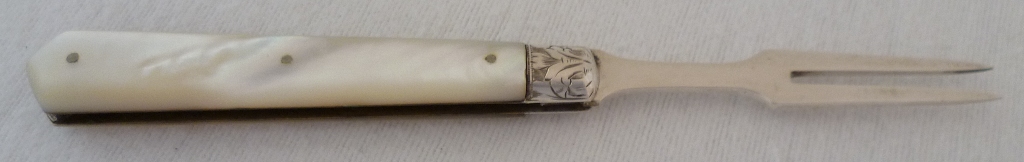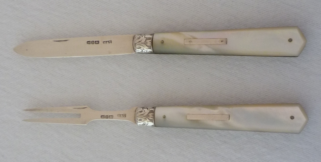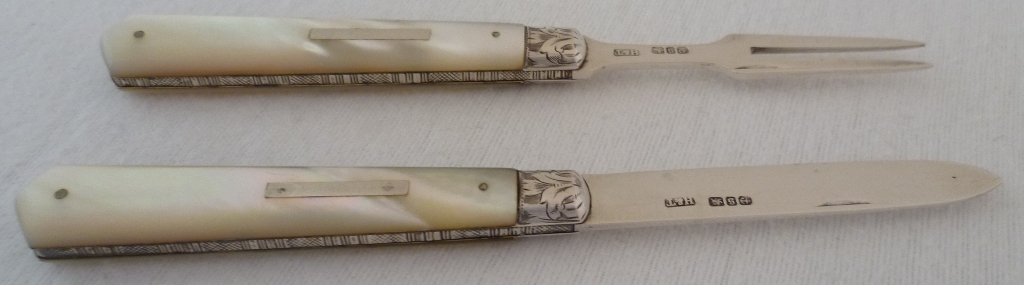 | DESCRIPTION | Fine quality Victorian silver folding fruit knife and fork set with mother of pearl faced handles all within a gilt tooled velvet and silk lined fitted case. |