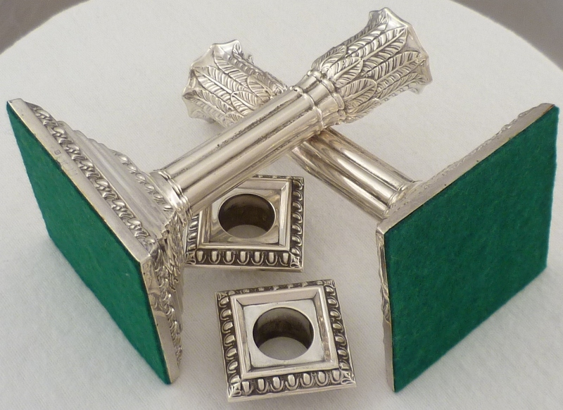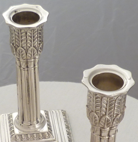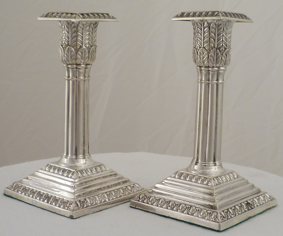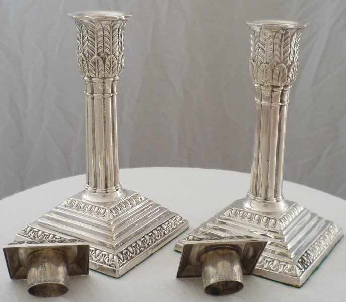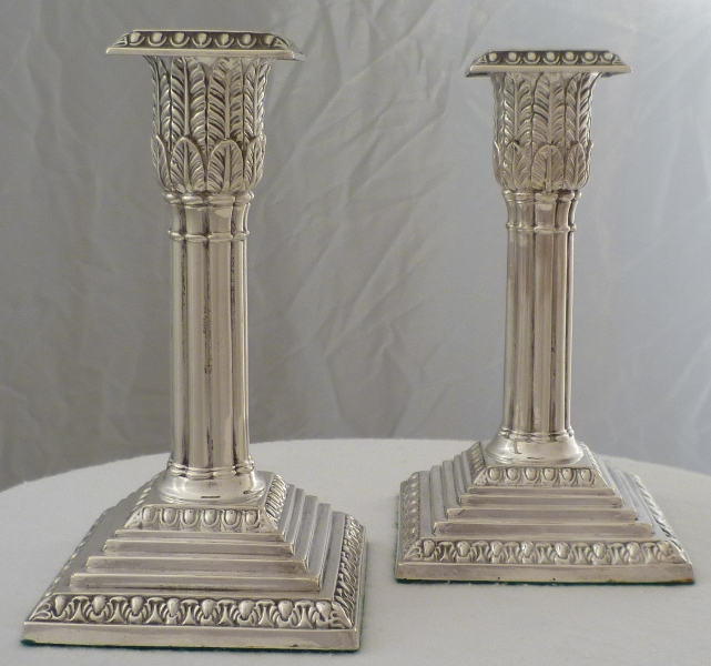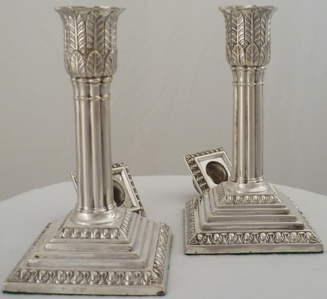 DESCRIPTION | Fine pair of Edwardian loaded silver acanthus column candlesticks with removable, correctly hallmarked, sconces and felt lined bases. |