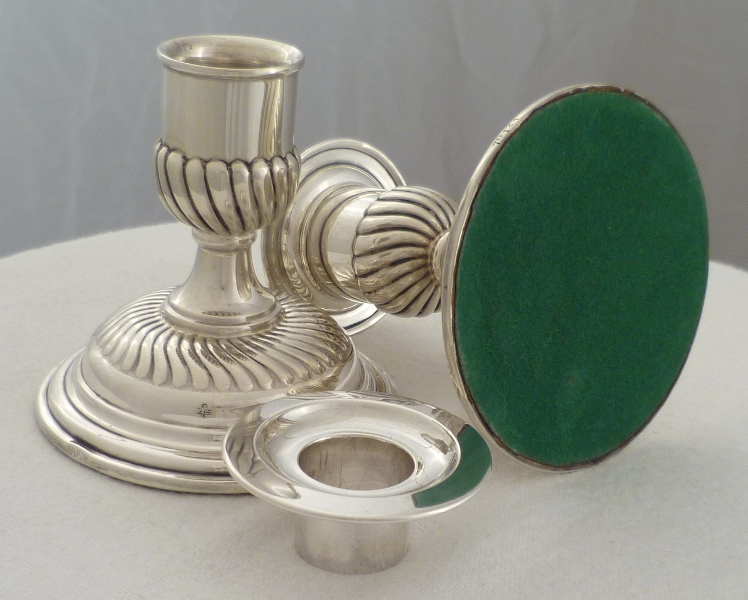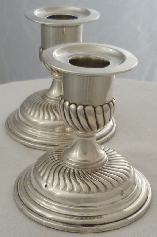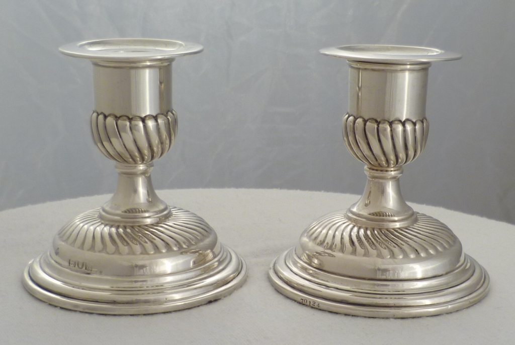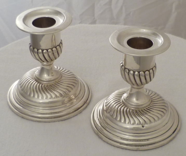 DESCRIPTION | Finest quality pair of Victorian silver candlesticks with felt lined and loaded circular bases, ring turned and fluted decoration and urn capitals with removable sconces. |