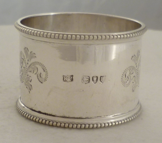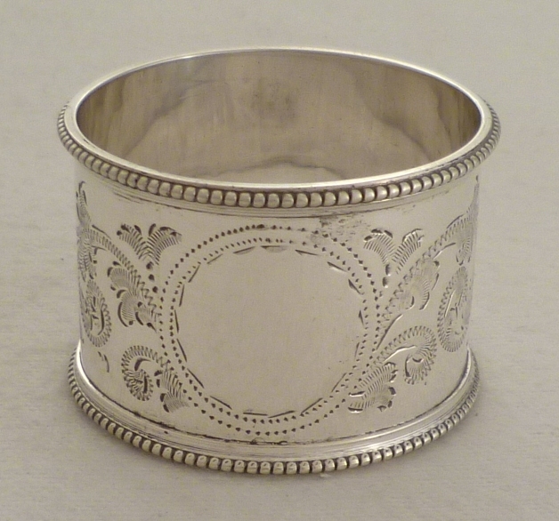 DESCRIPTION | Good Victorian silver napkin ring with engraved floral decoration and a blank circular cartouche. |