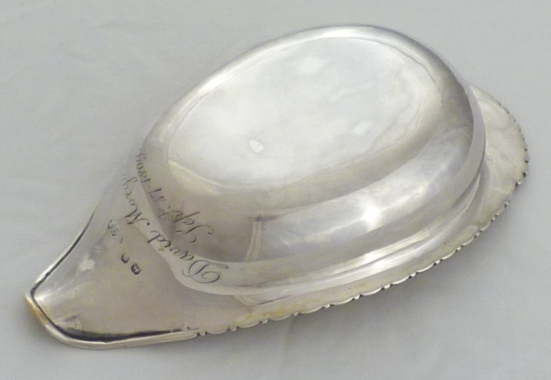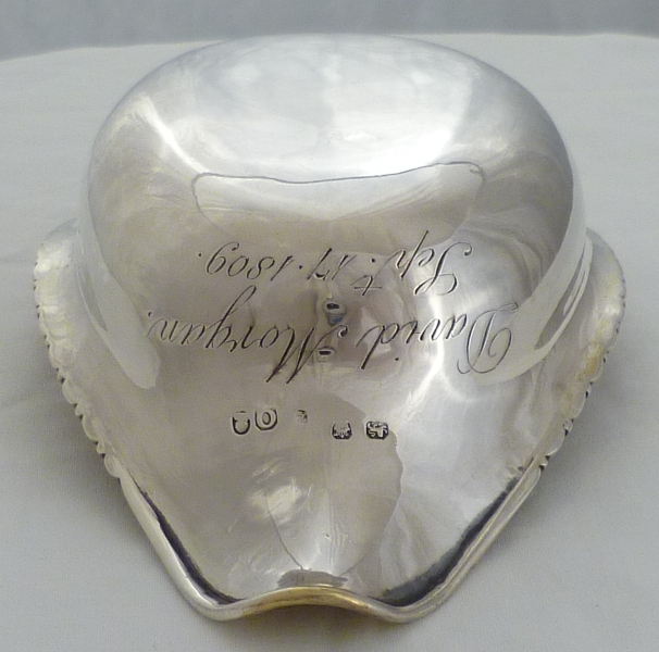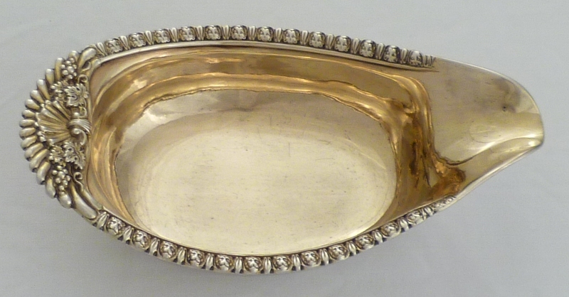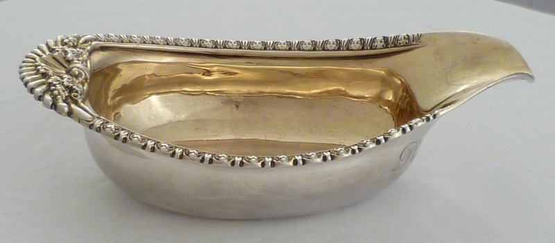 DESCRIPTION | Good Georgian silver pap boat with a fully gilded interior and heavily decorated top rim including fruiting vines. Inscribed below the hallmarks 'David Morgan Sept. 17. 1809.' |