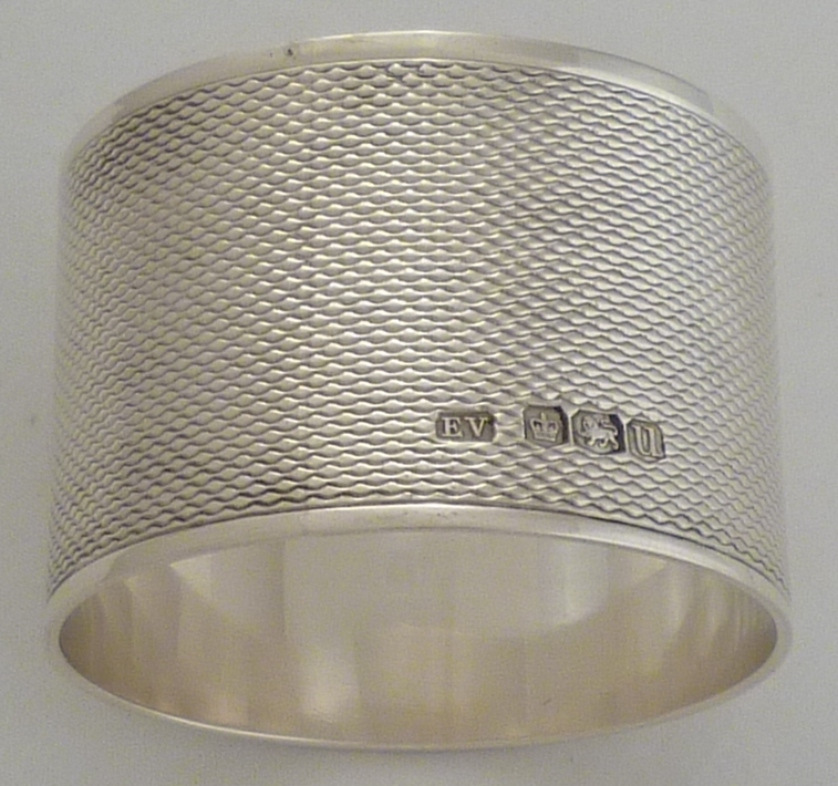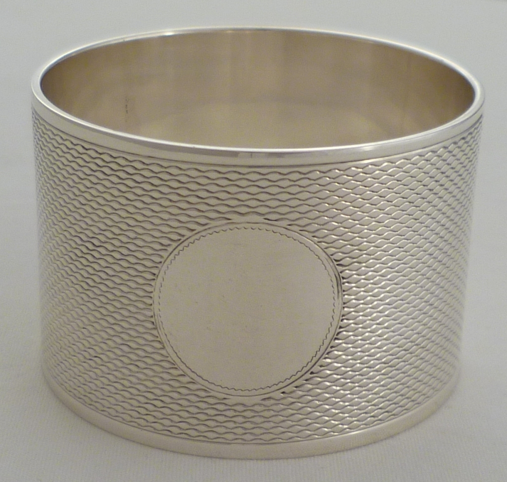 DESCRIPTION | Perfect and good quality silver napkin ring with engine turned decoration and blank circular cartouche that has never been engraved. |