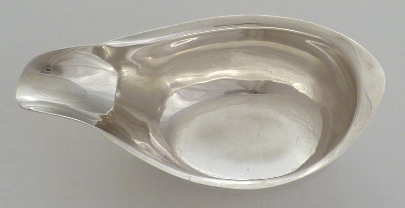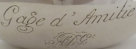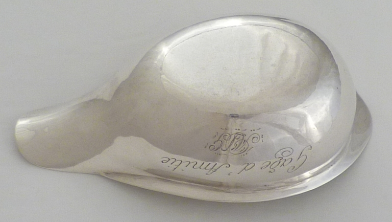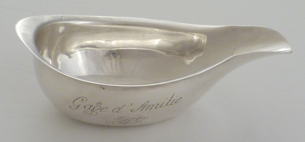 DESCRIPTION | Smaller English Georgian silver pap boat with a French engraved inscription and monogram. |