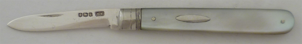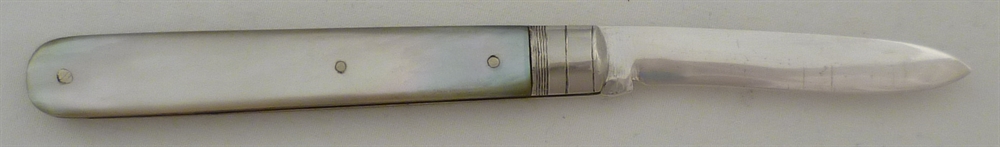 | DESCRIPTION | Folding fruit knife with a silver blade and mother of pearl lined body. |