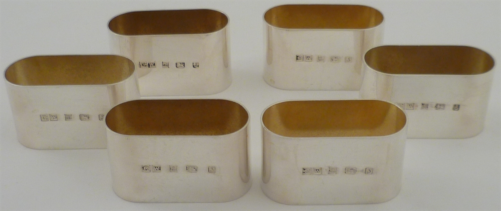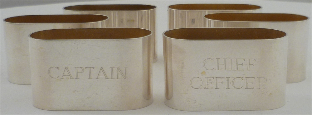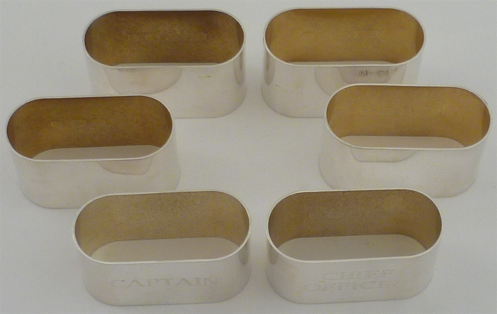 DESCRIPTION | Set of six heavy silver napkin rings with matt gilded interiors. One is lightly engraved 'CAPTAIN', one 'CHIEF OFFICER' and four have no engraving or erasure. |