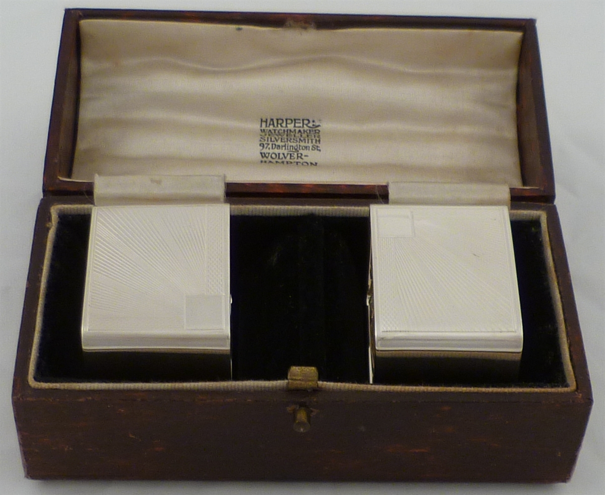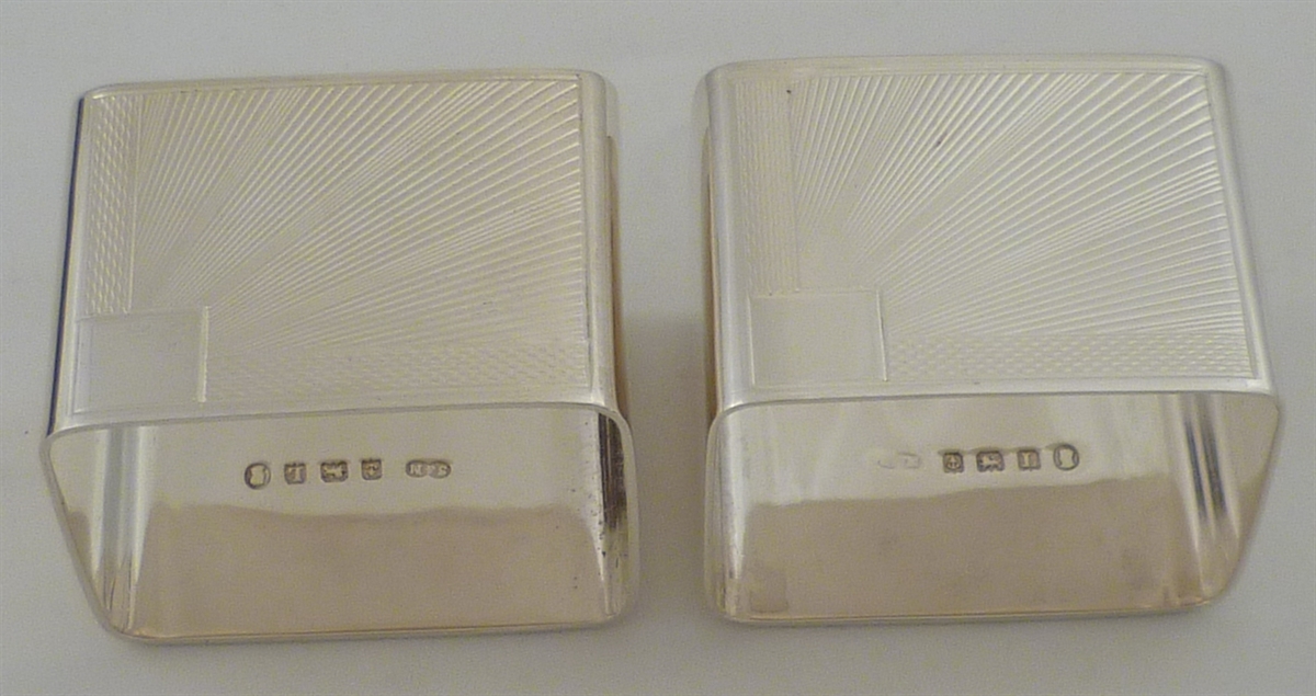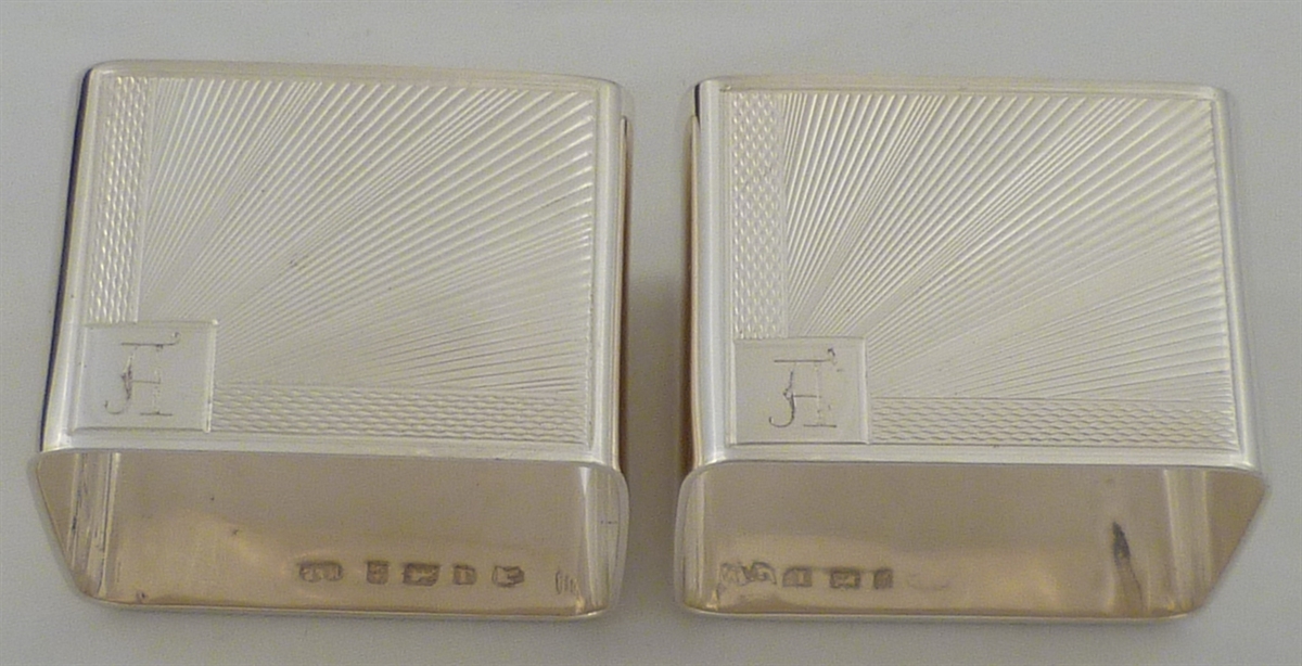 DESCRIPTION | Good quality, very stylish and cased pair of solid silver art deco napkin rings with engraved sunburst decoration and a simple initial engraving to one cartouche. |