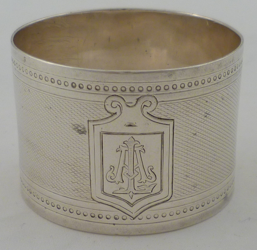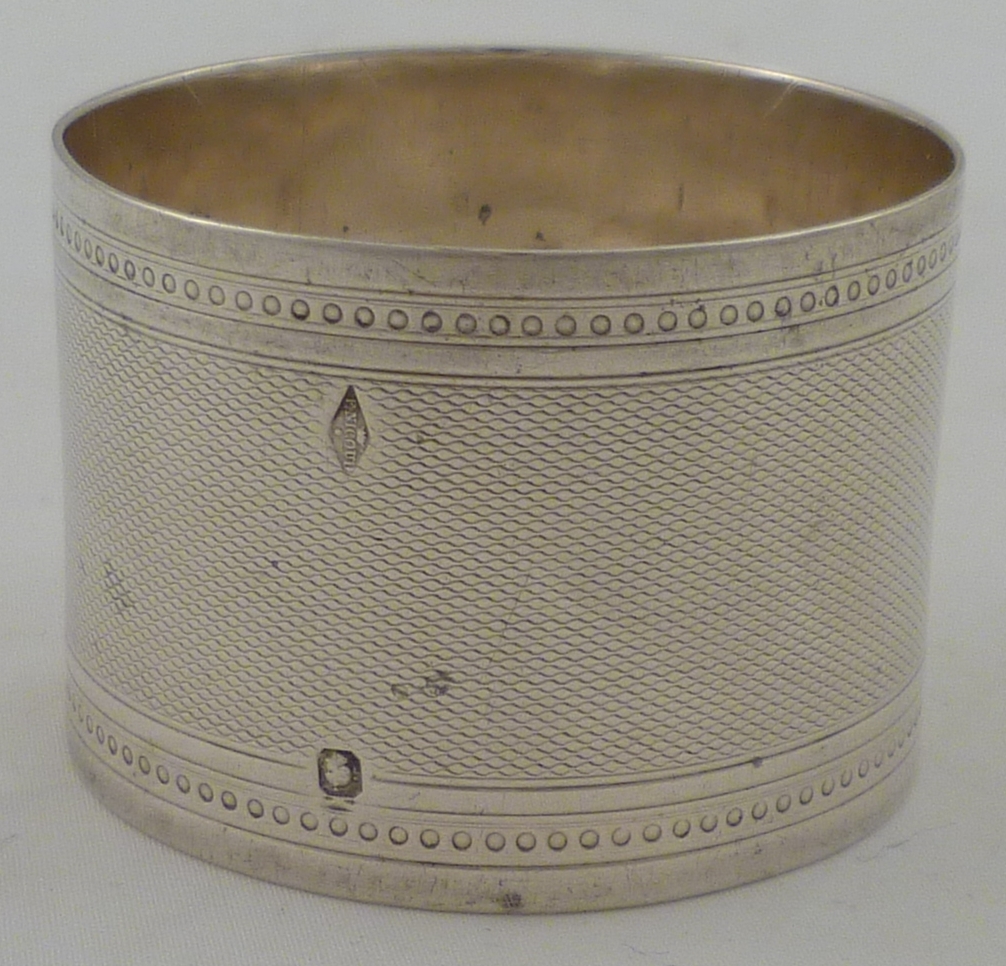DESCRIPTION | Large 19th century French solid silver napkin ring with decorative engine turned engraving and a monogram engraved cartouche. |