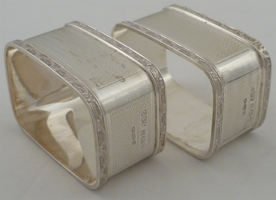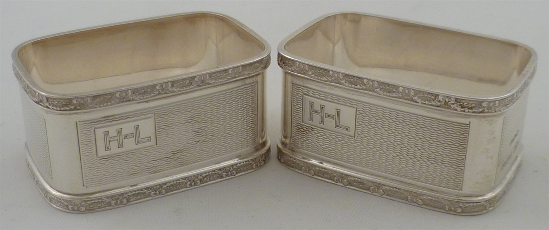DESCRIPTION | Pair of highest quality solid silver napkin rings with decorative engine turned engraving and cartouche engraved H-L. |
