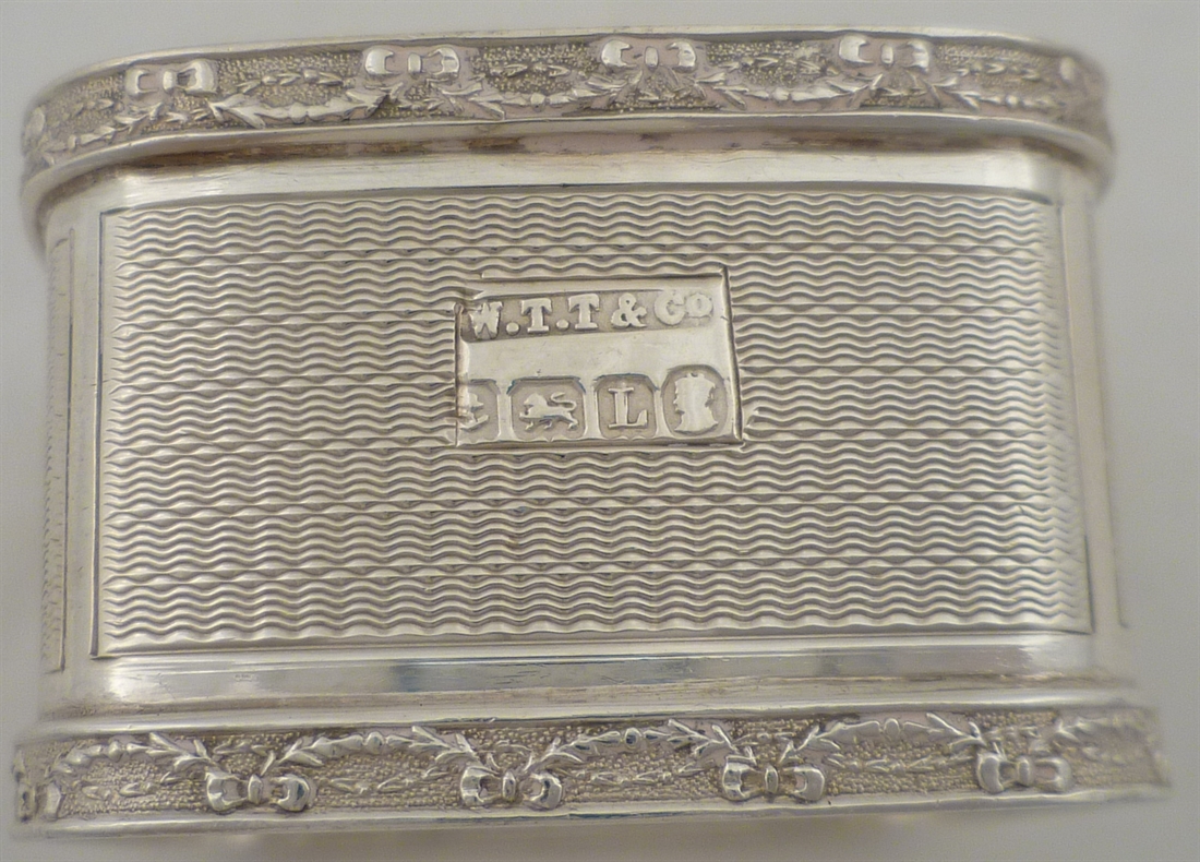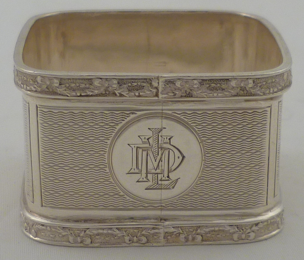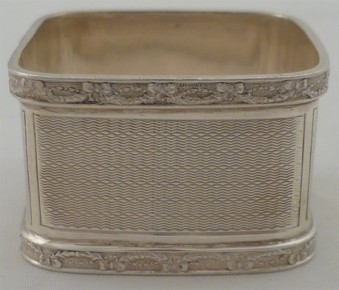 DESCRIPTION | Good quality square solid silver napkin ring with decorative engine turned engraving and a monogram engraved cartouche. |