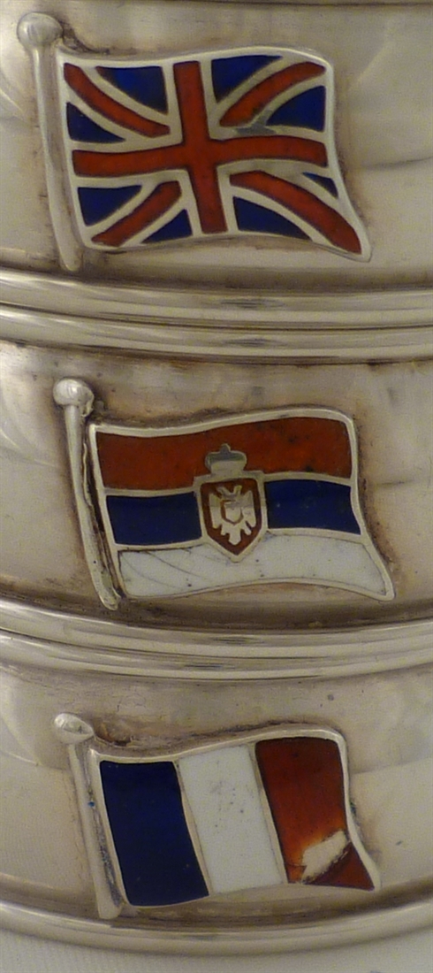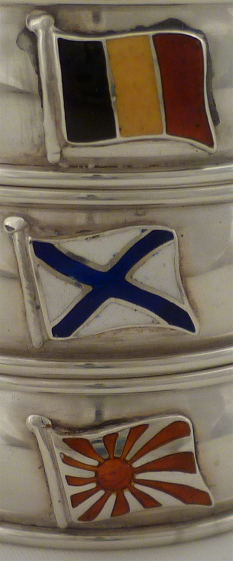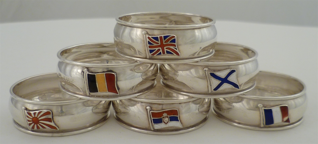 DESCRIPTION | Interesting set of six solid silver napkin rings, each enamelled with a different flag. Great Britain, the Rising Sun of Japan, France, Belgium, Serbia, Russian Naval Ensign. These are the flags of the Allies early in WWI about 1914, before Italy joined in 1915. |