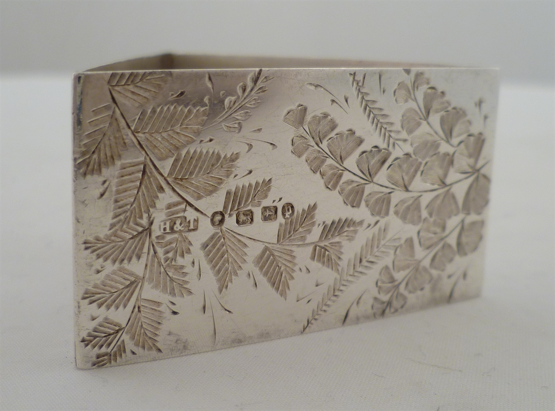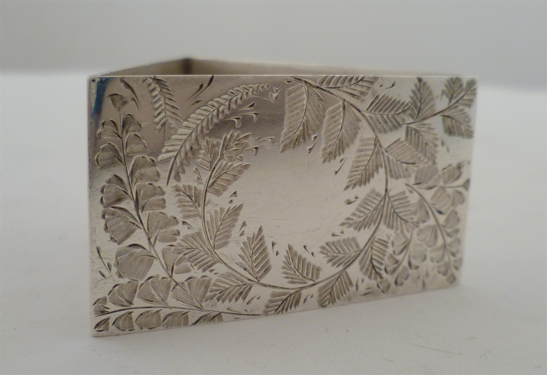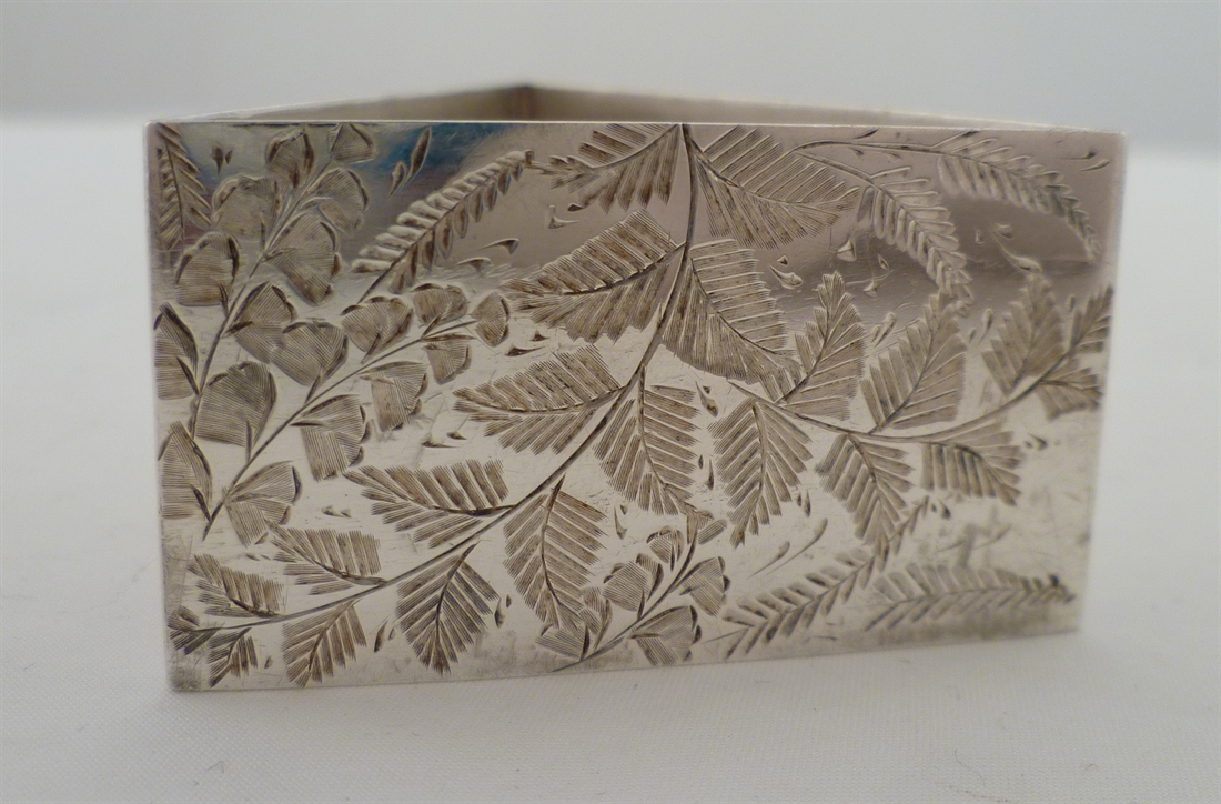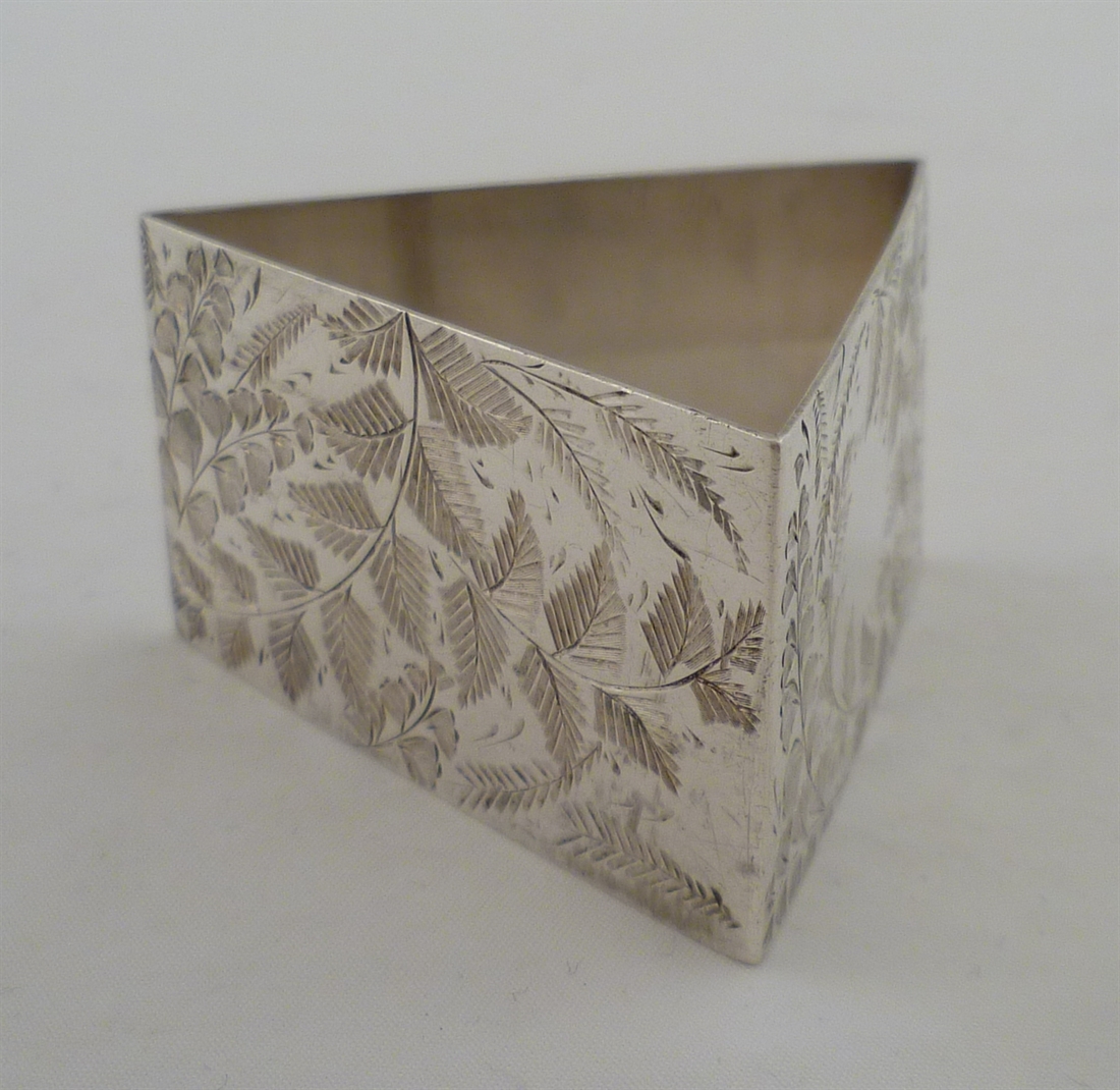 DESCRIPTION | Good Victorian English solid silver triangular napkin ring with engraved fern decoration. |