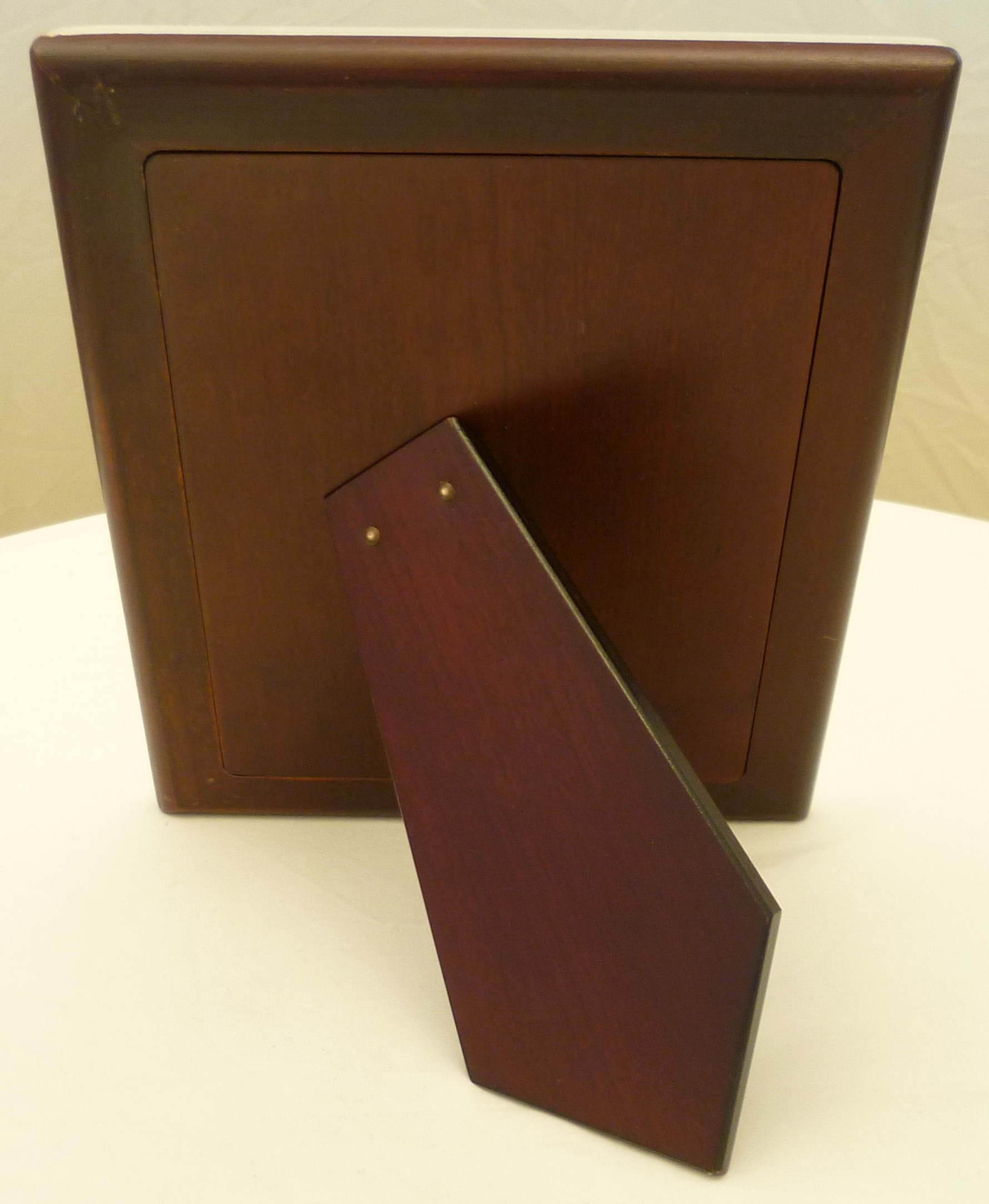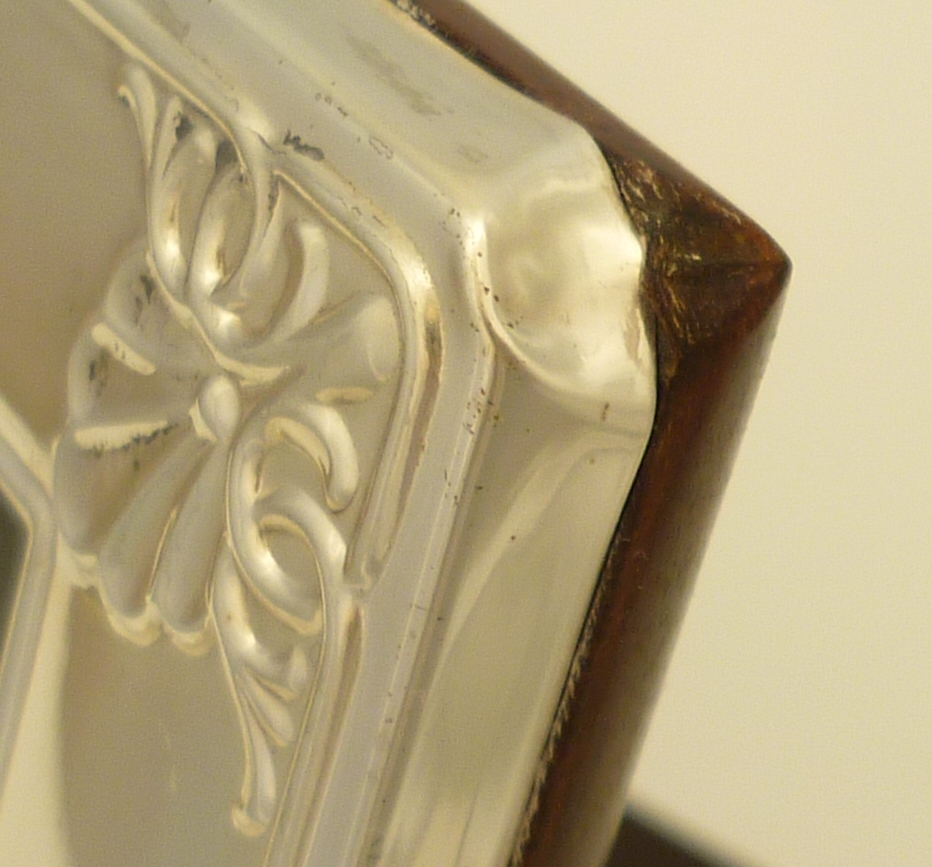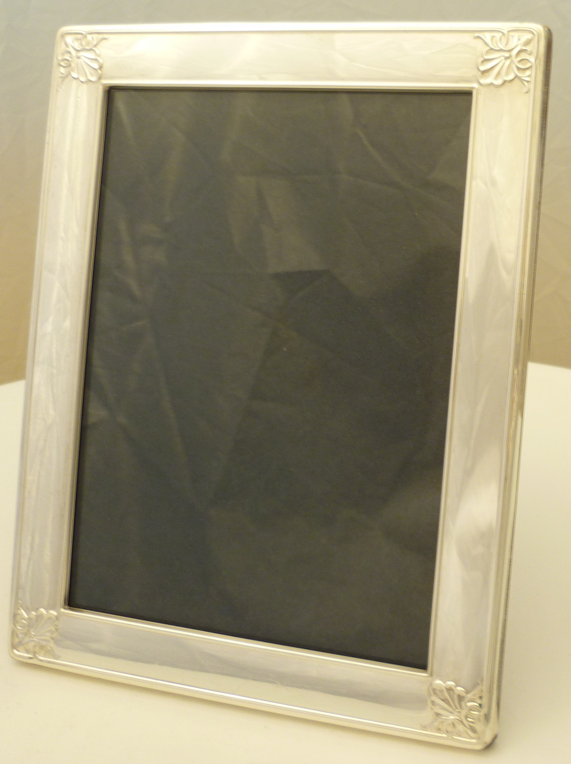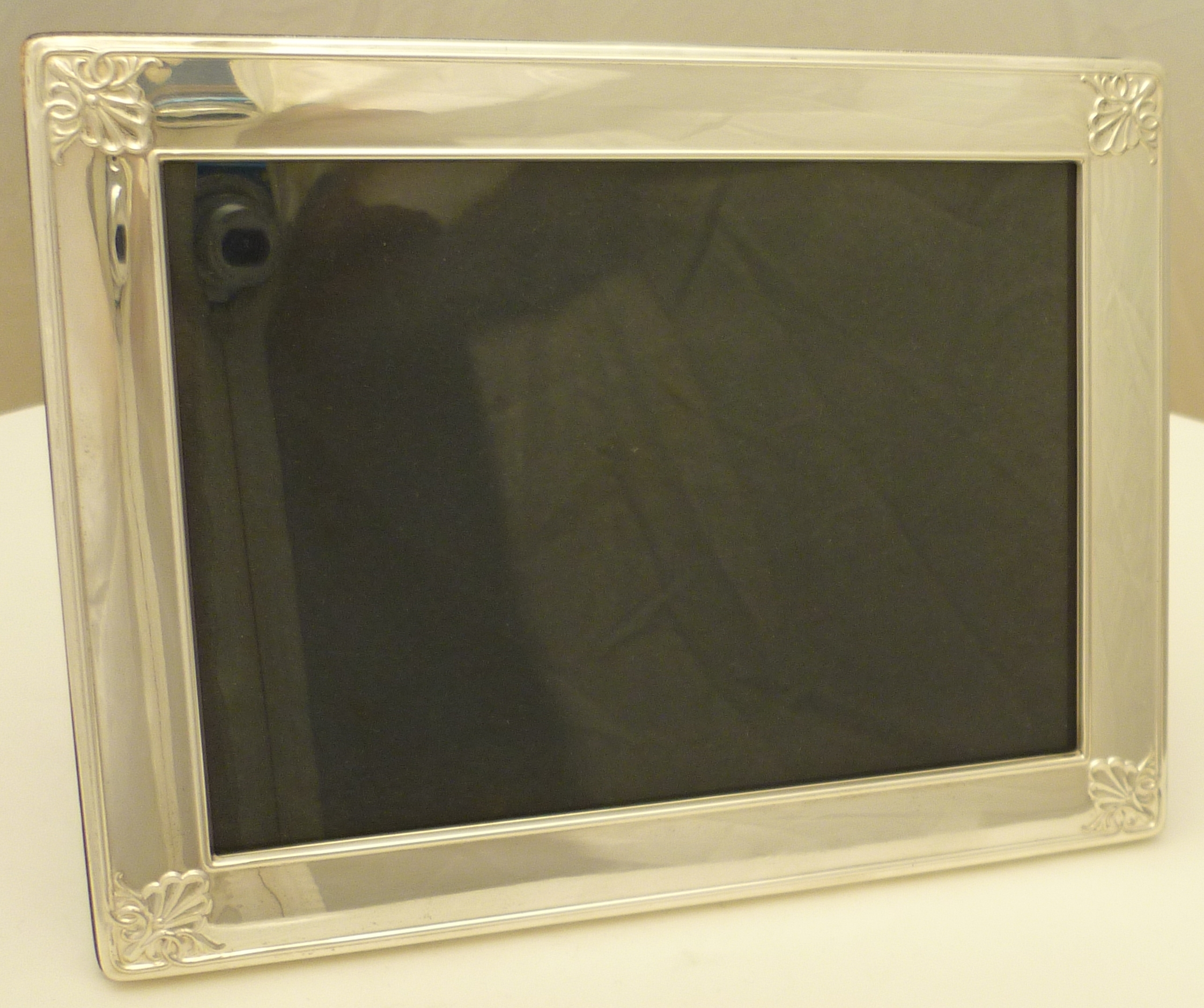 DESCRIPTION | Very good solid sterling silver mounted photograph frame with decorated corners and a wood strut back that works landscape and portrait. |