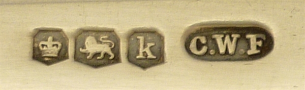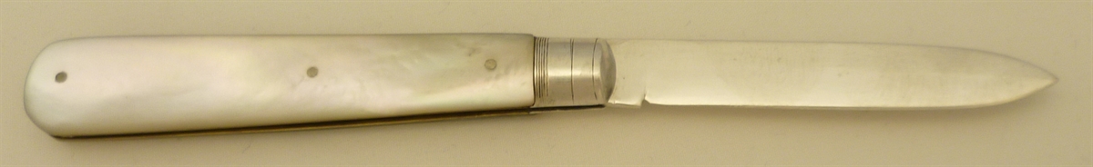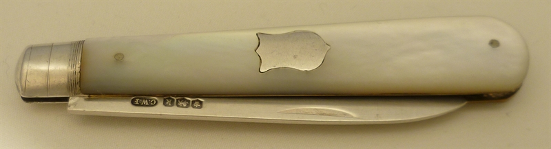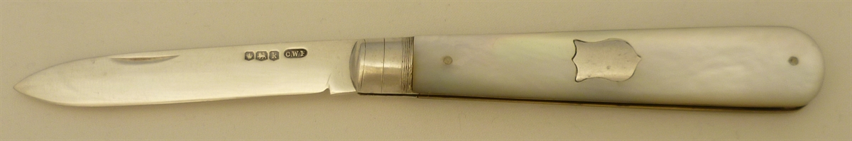 | DESCRIPTION | Very good solid sterling silver folding fruit knife with mother of pearl sides, one inset with a blank shield shaped cartouche. |