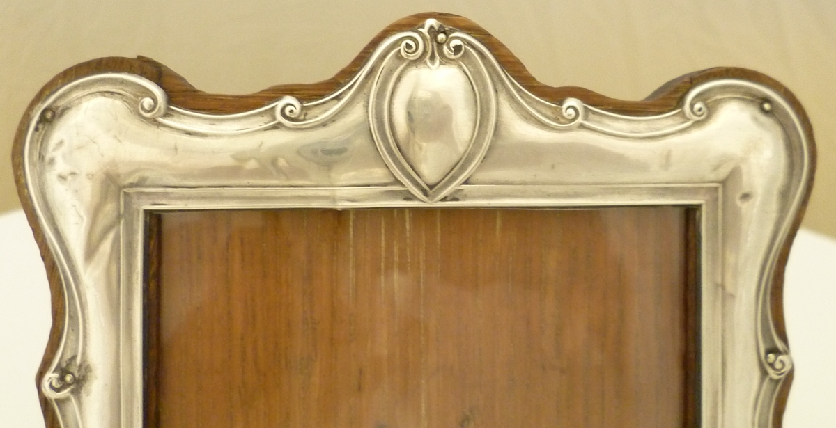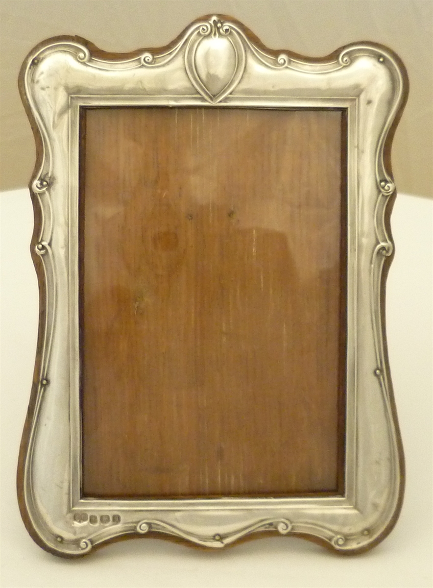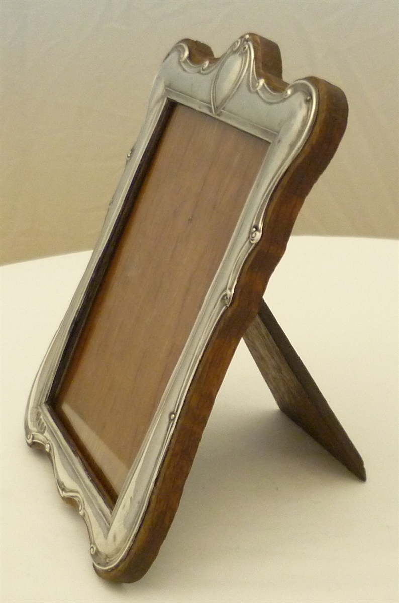 DESCRIPTION | Very good solid sterling silver mounted photograph frame with an oak body and strut back. The blank cartouche has never been engraved |