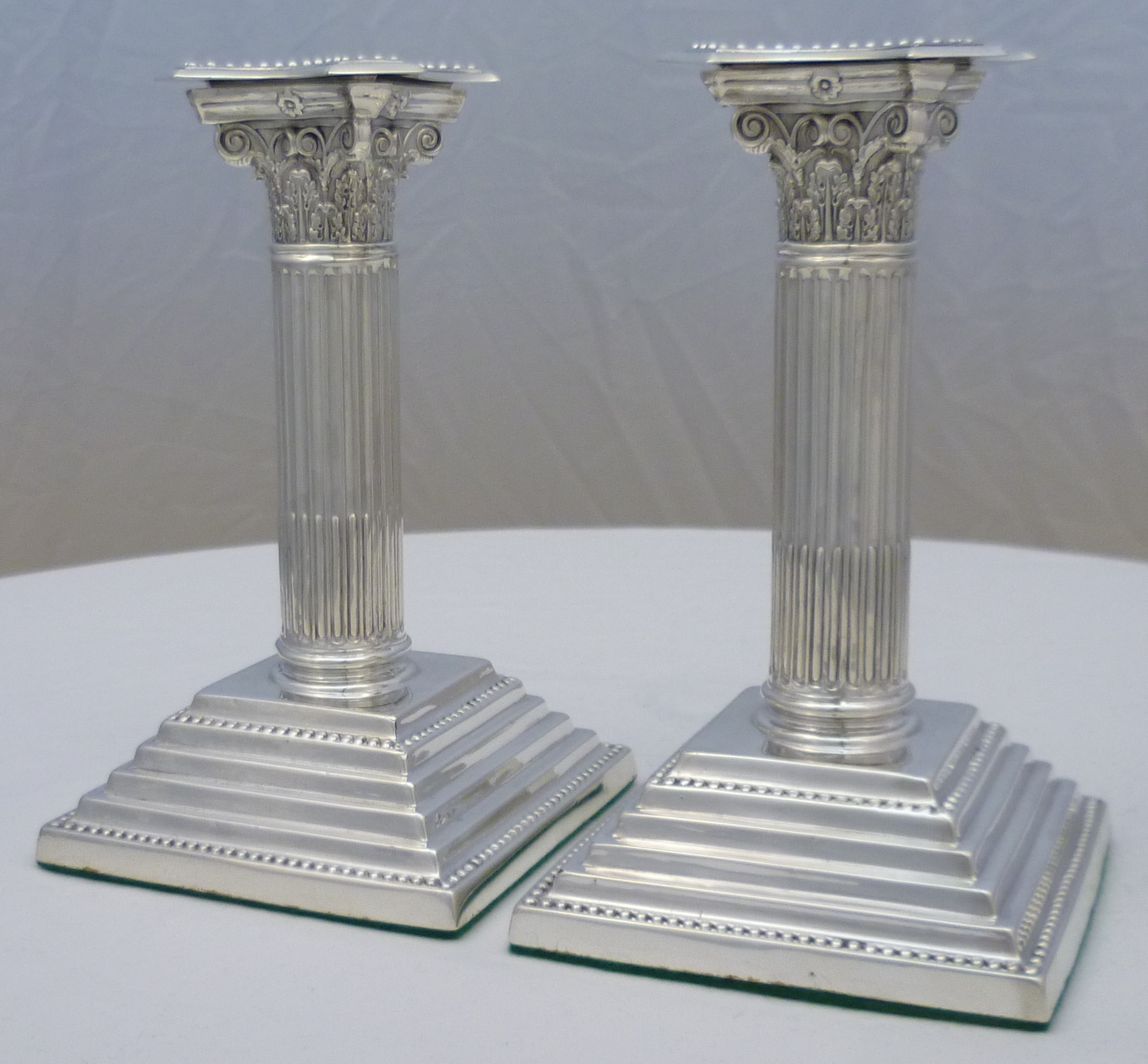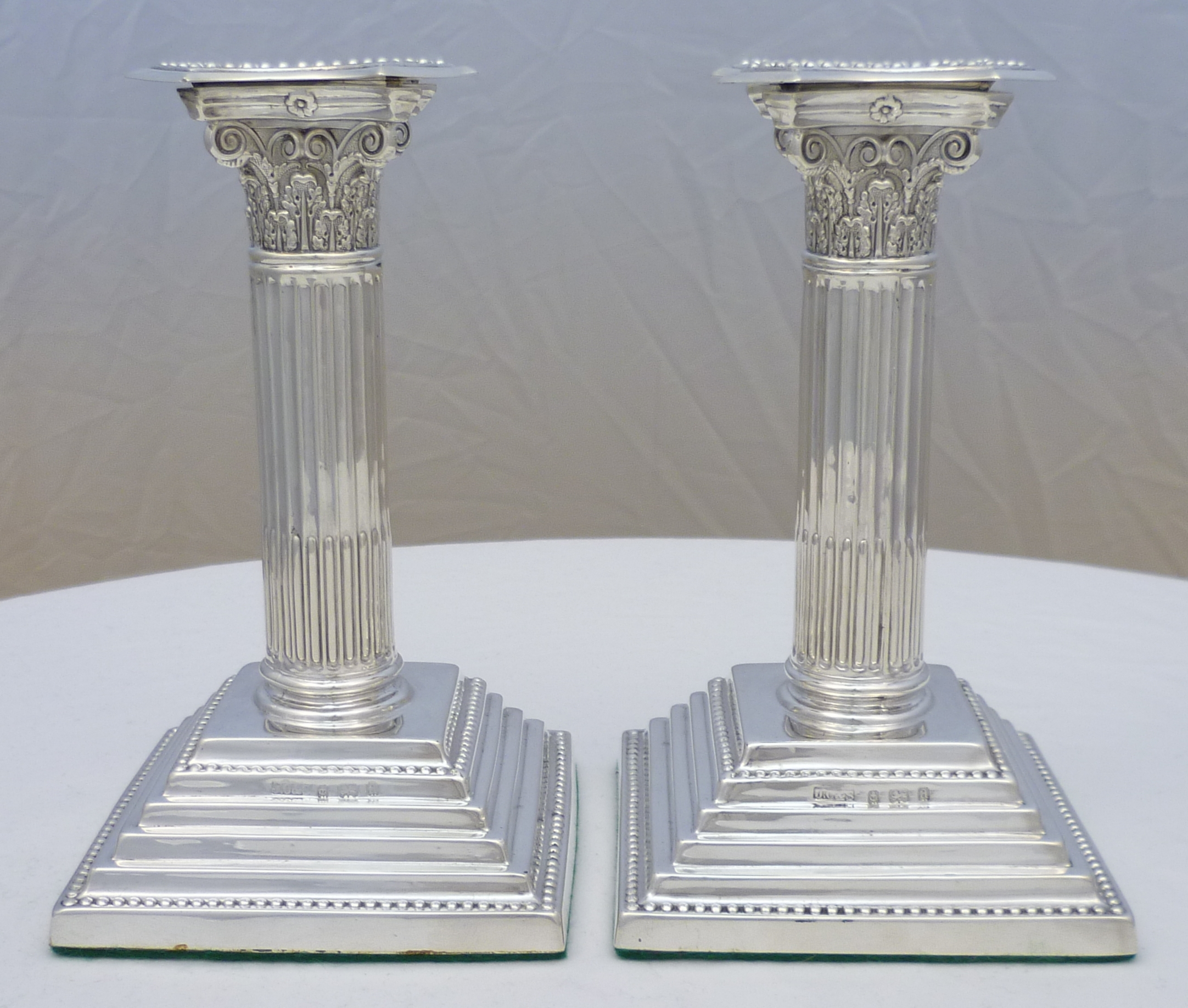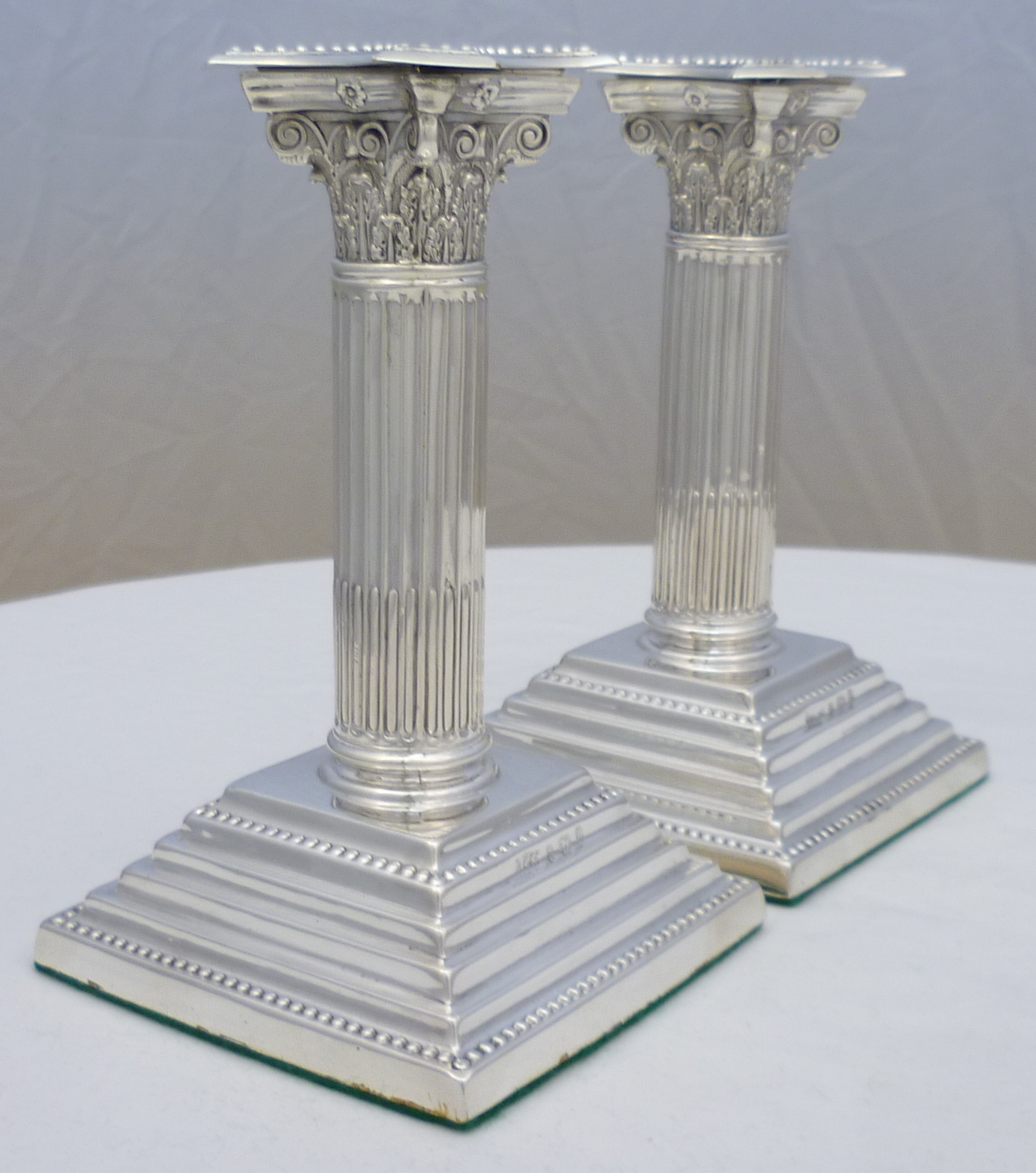 DESCRIPTION | Superb pair of Victorian loaded sterling silver Corinthian column candlesticks with beautifully detailed finials and removable sconces. |