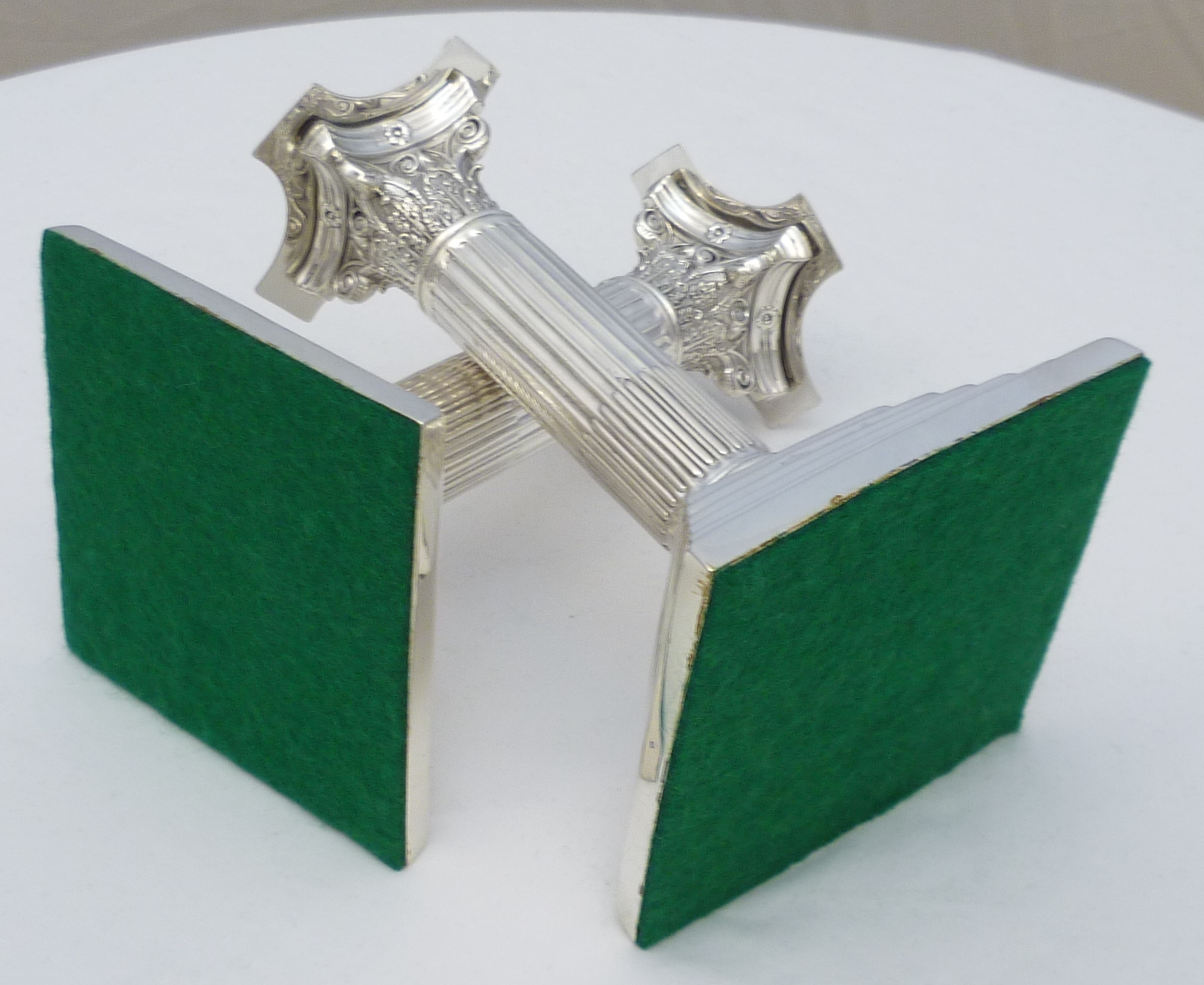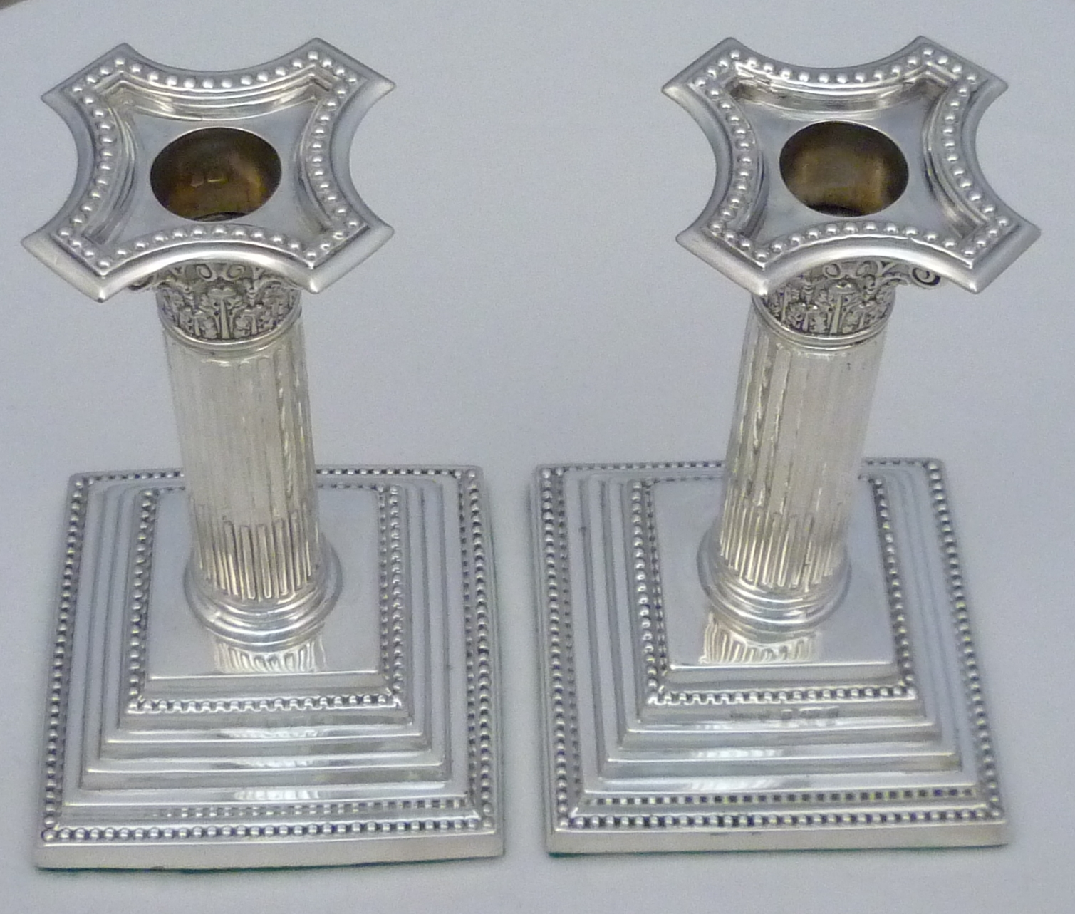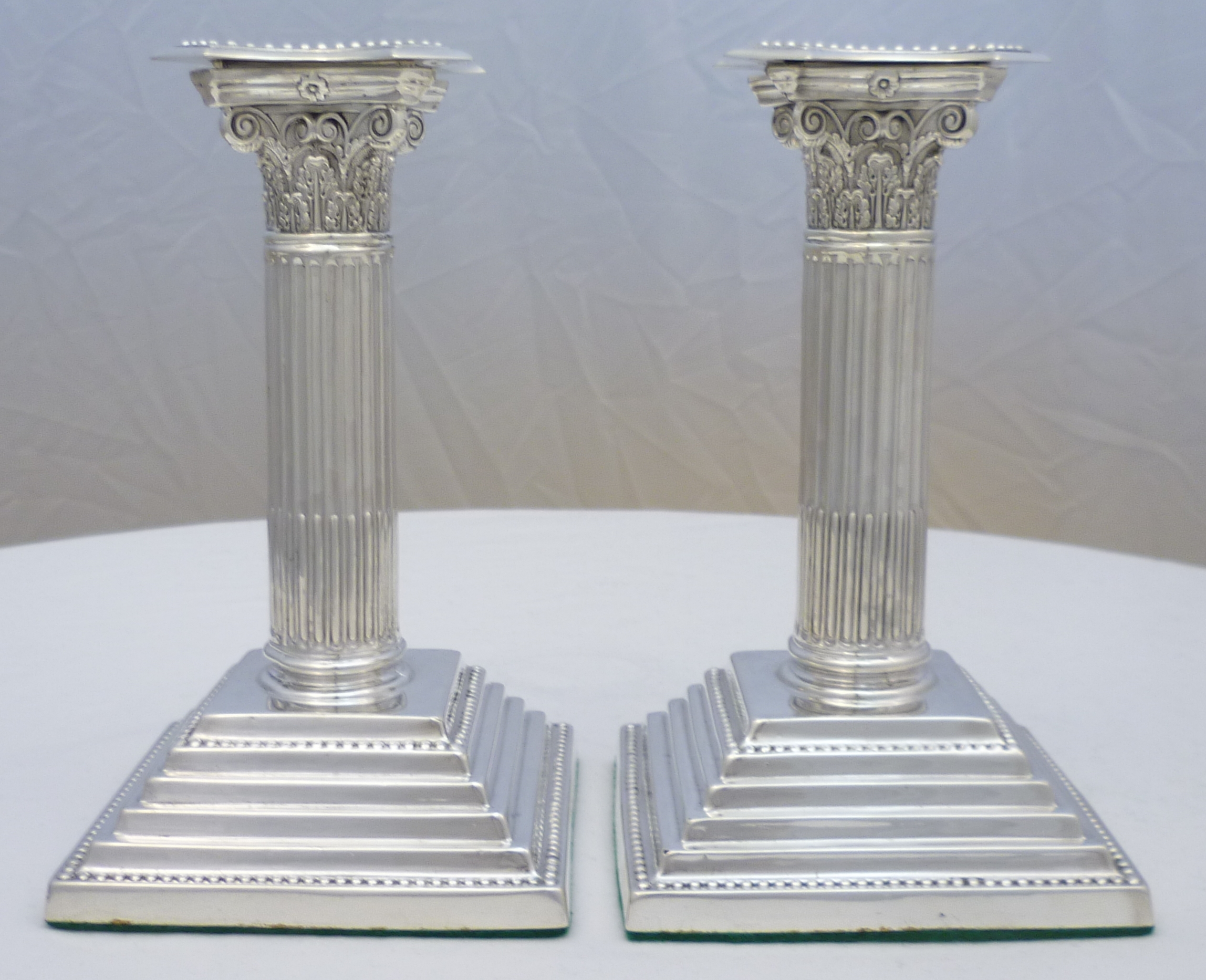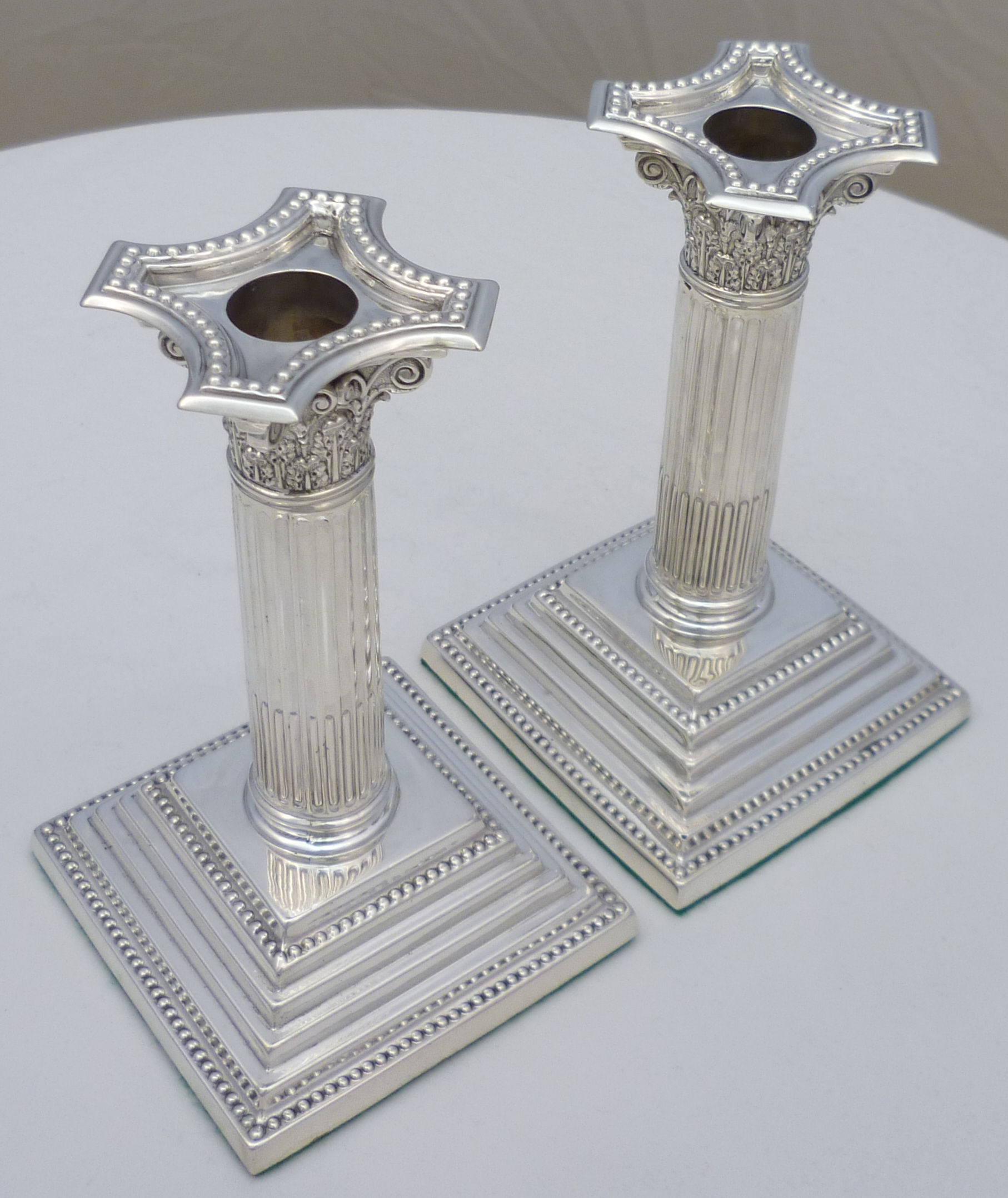 DESCRIPTION | Superb pair of Victorian loaded sterling silver Corinthian column candlesticks with beautifully detailed finials and removable sconces. |