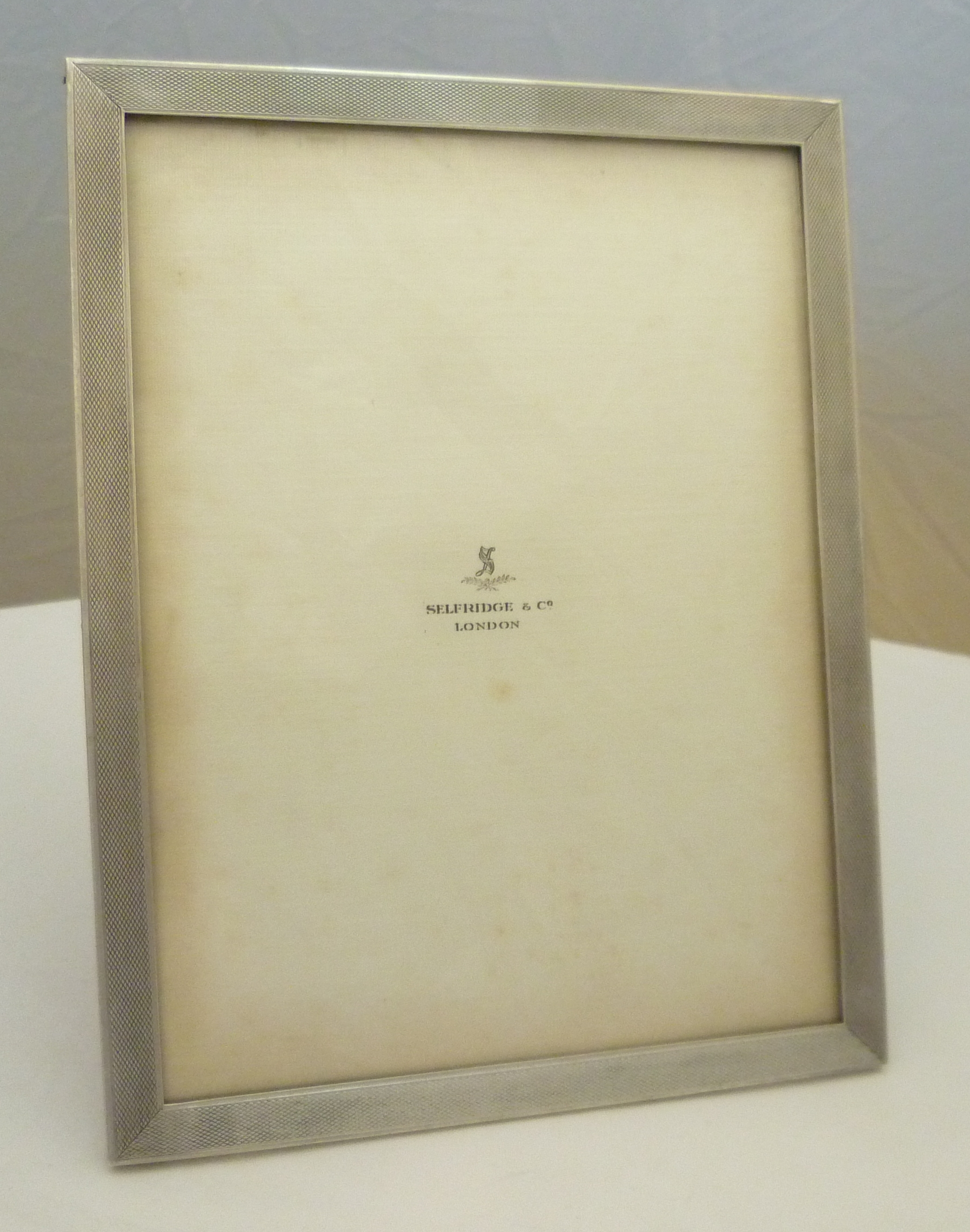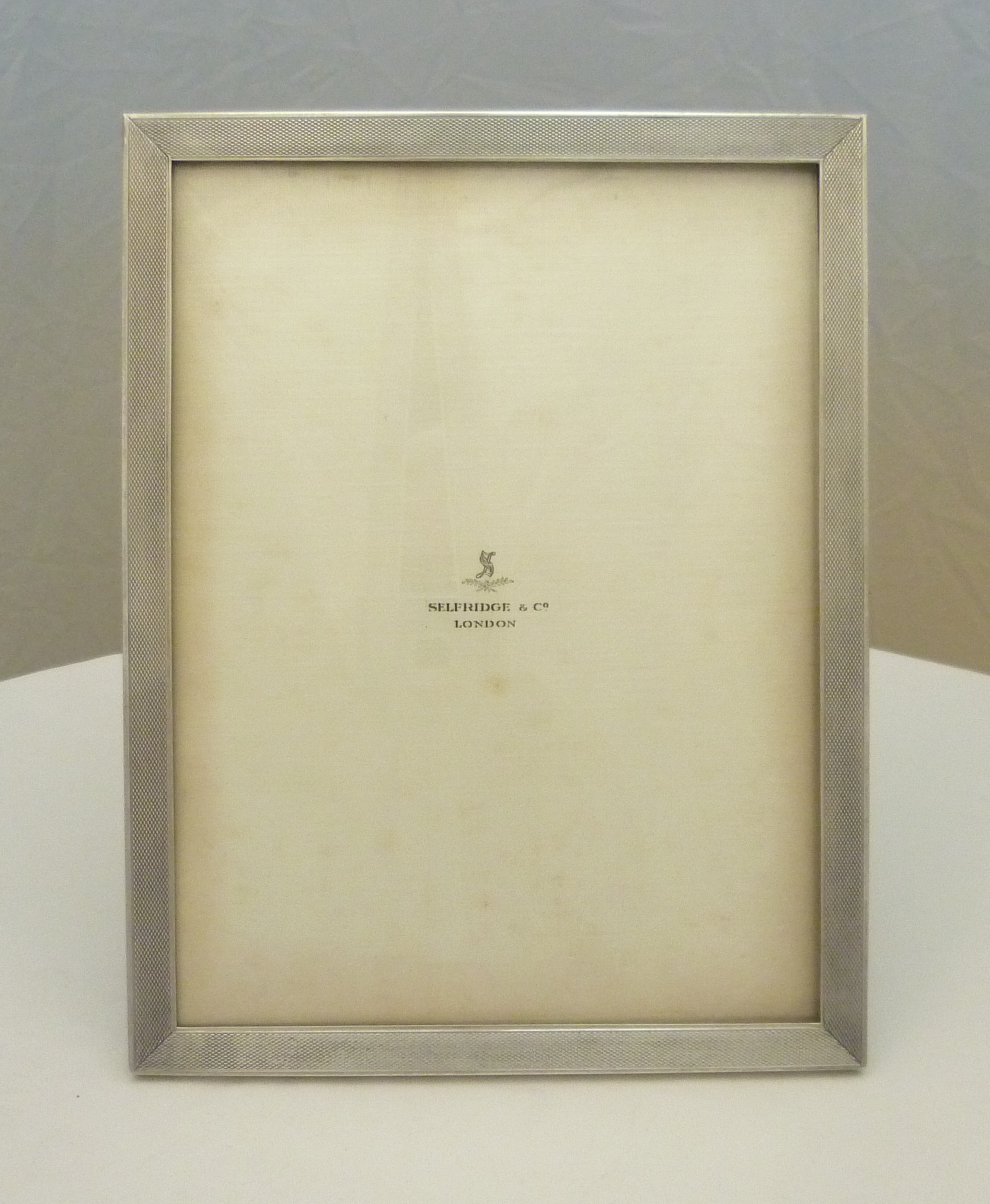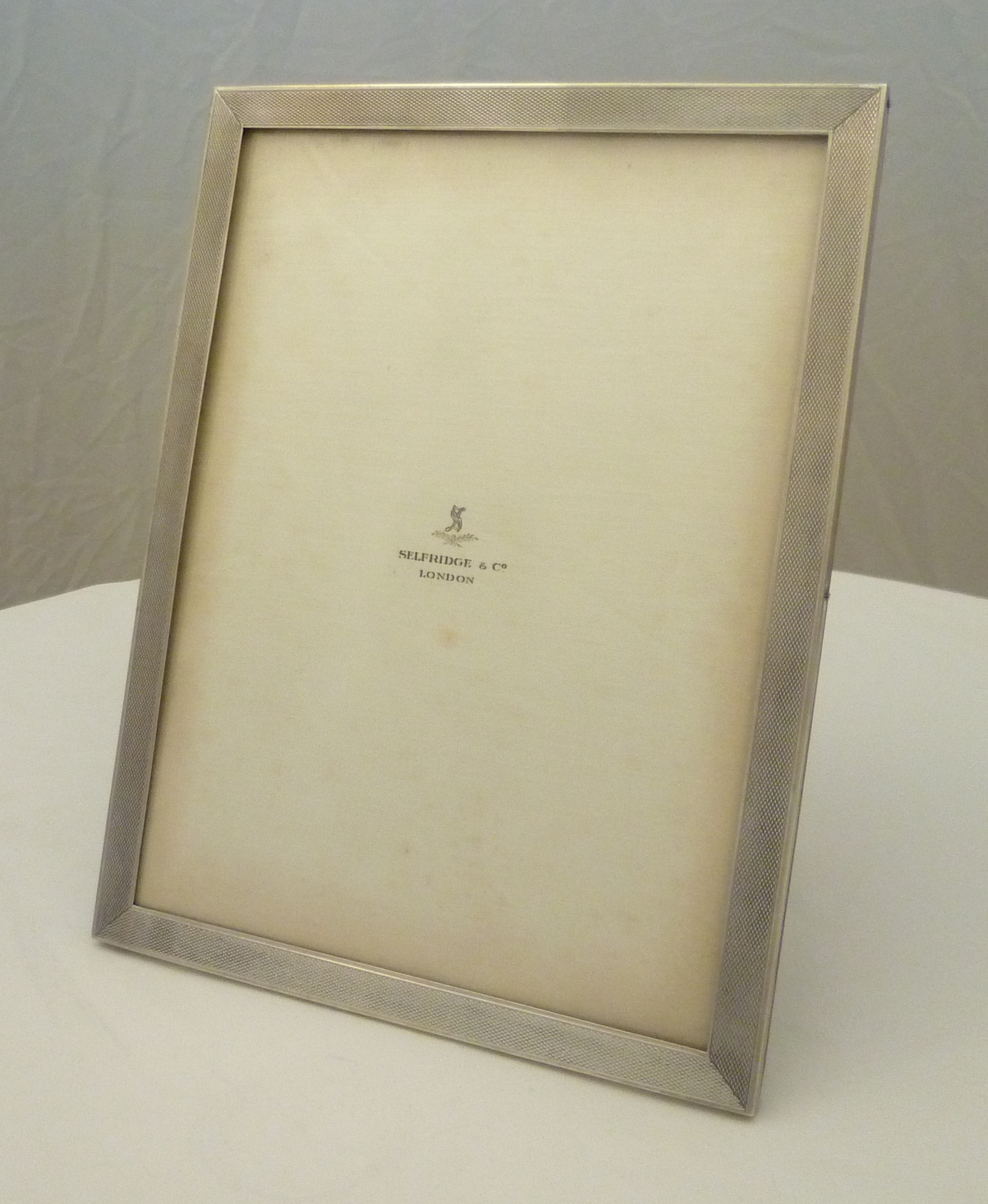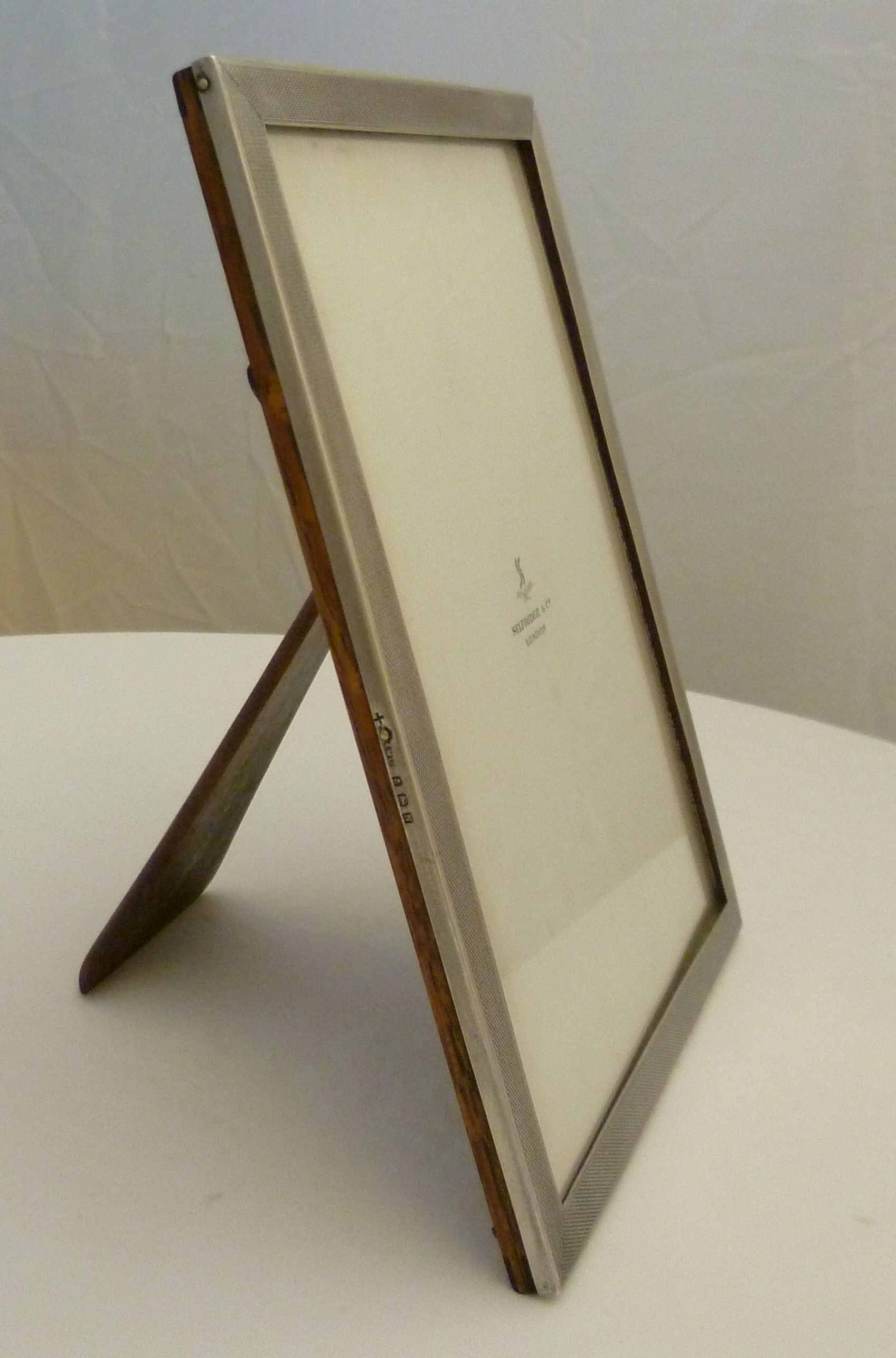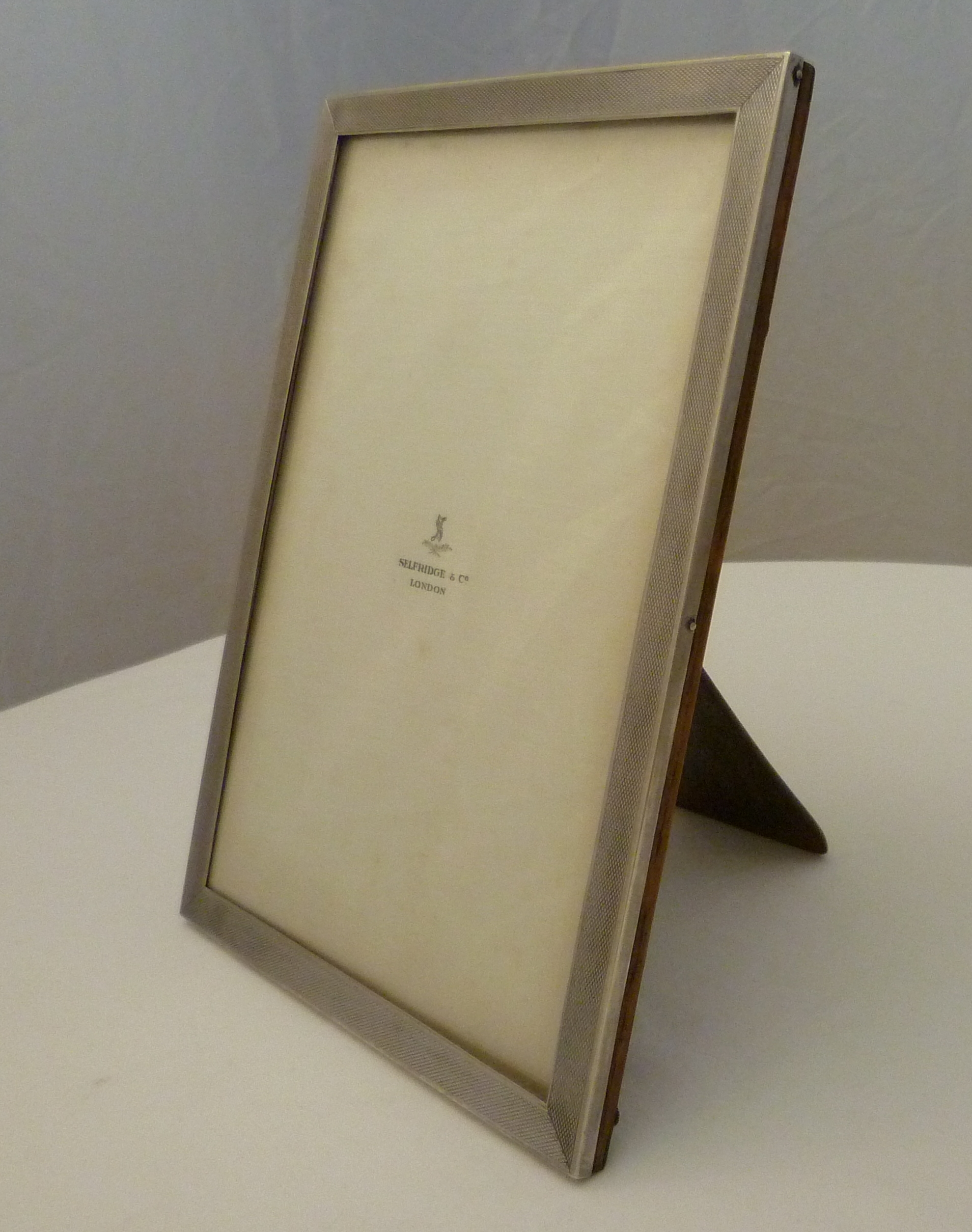 DESCRIPTION | Excellent solid sterling silver mounted portrait photograph frame with engine turned decoration and a wood strut back. Retailed by Selfridge & Co. |