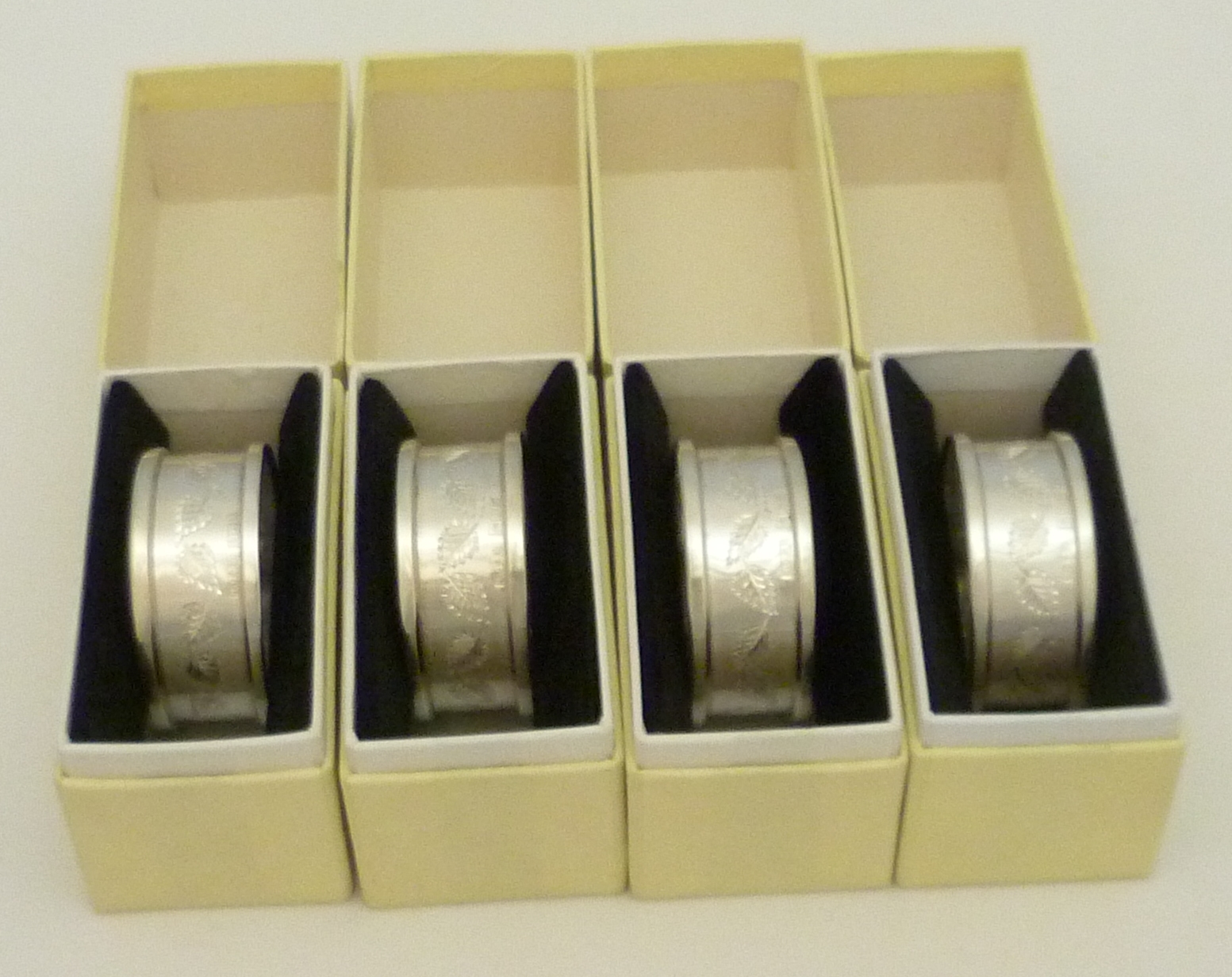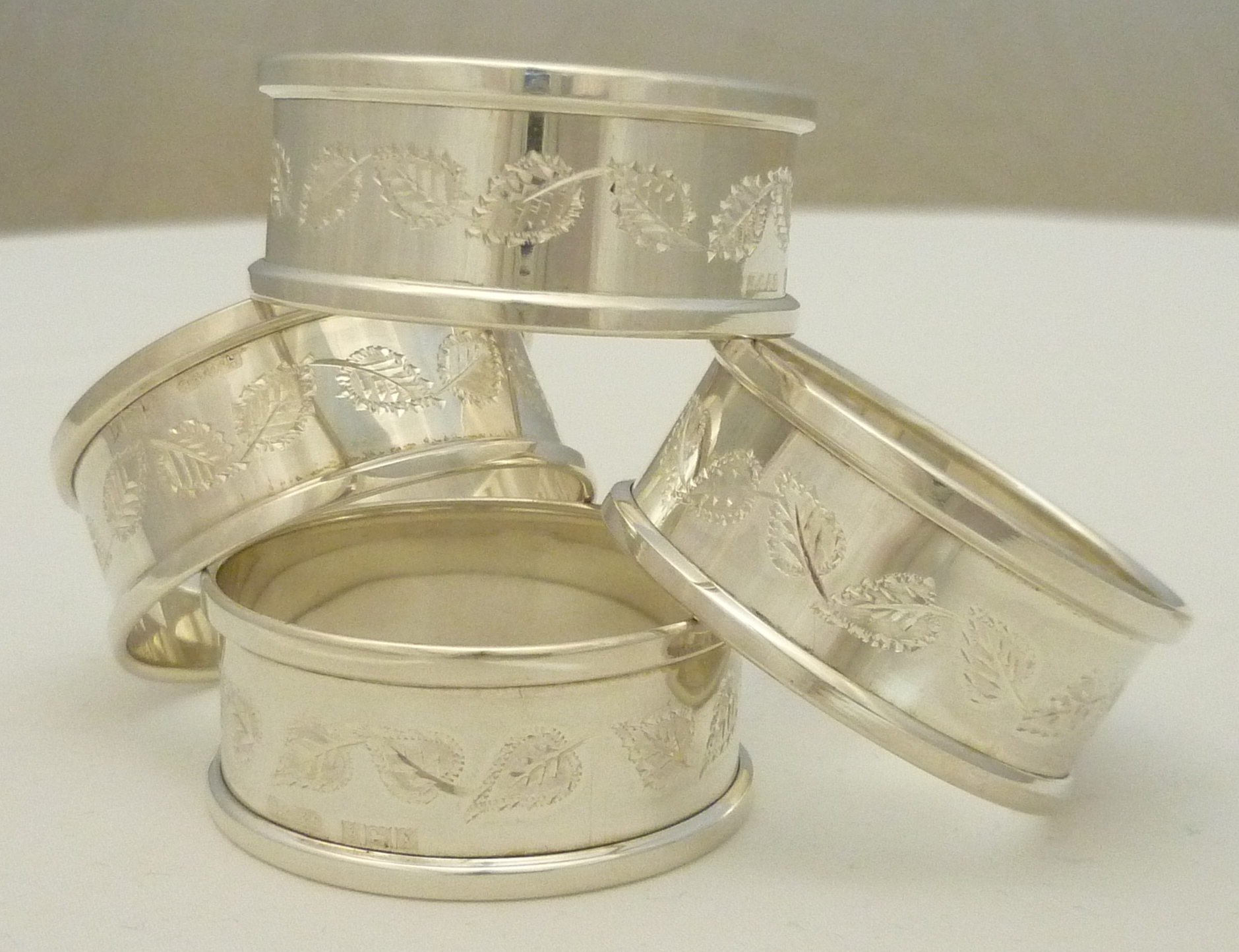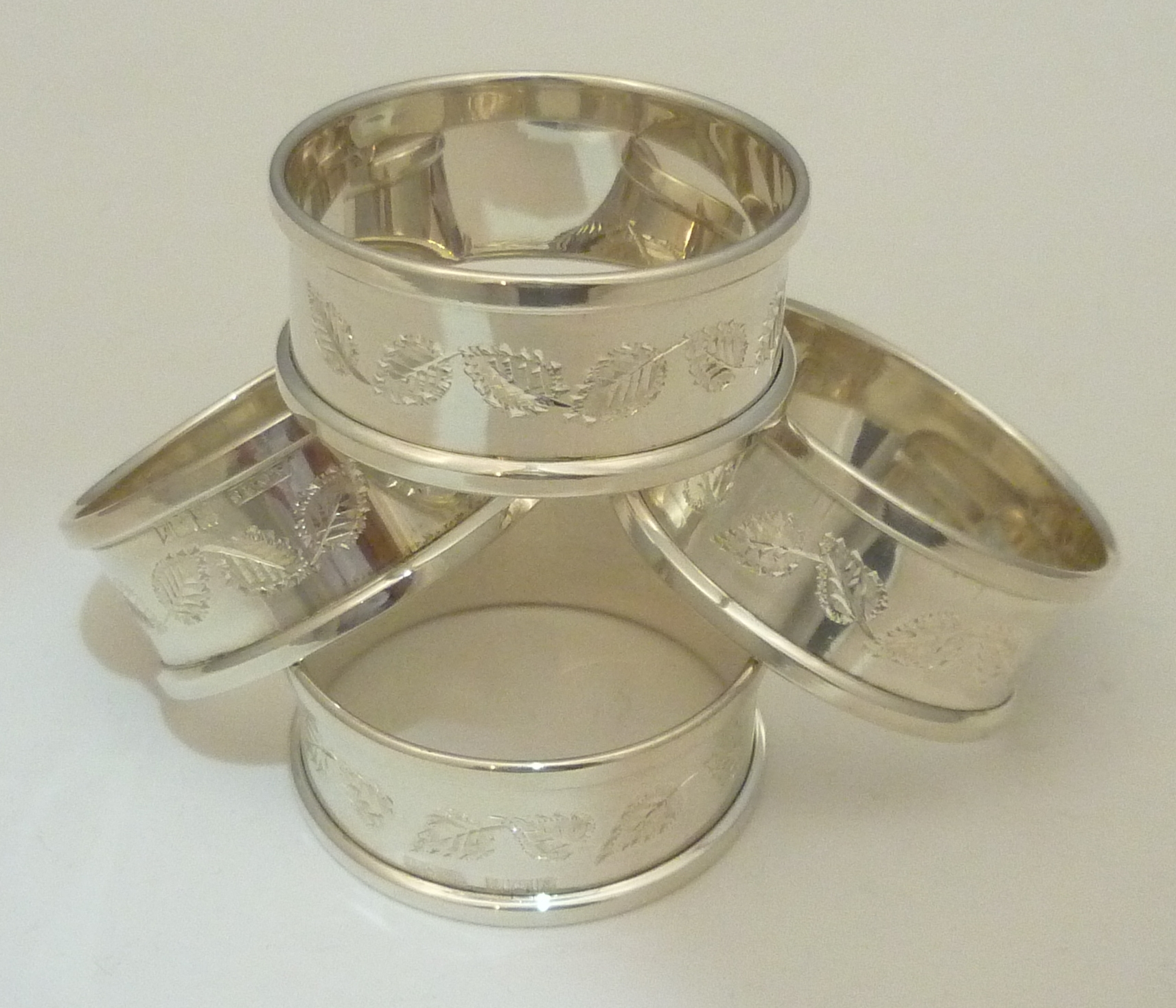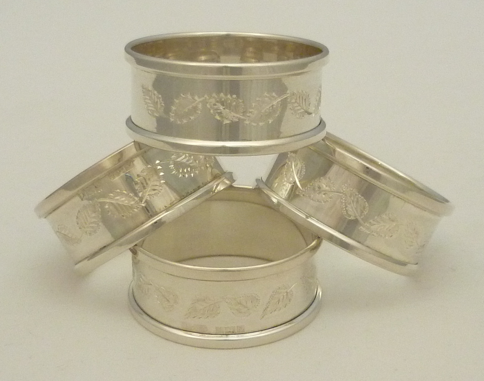 DESCRIPTION | Very good set of four solid sterling silver napkin rings with engraved foliate decoration and no inscriptions. Each contained within the original jeweller's box and none appear to have been used. |